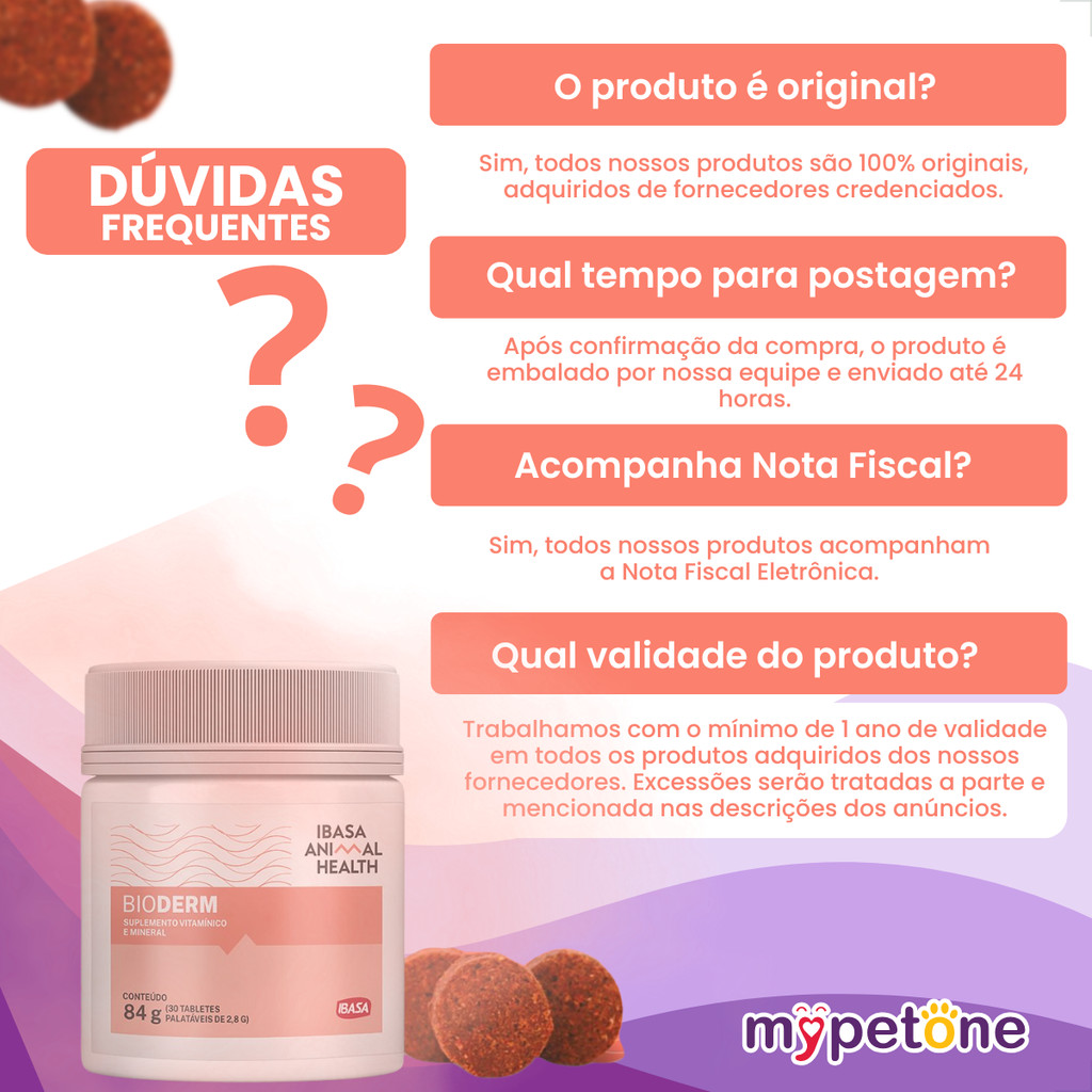 Suplemento Bioderm Ibasa para Cães e Gatos - 30 Tabletes O Bioderm é um suplemento nutricional completo, ideal para promover o equilíbrio da saúde da pele e da pelagem de cães e gatos. Sua fórmula exclusiva age de dentro para fora, fortalecendo o eixo intestino-pele, especialmente em casos que exigem cuidados dermatológicos específicos. Benefícios: - Rico em ômegas: Alta concentração de ácidos graxos essenciais, incluindo o GLA (ácido gama-linolênico), com ação anti-inflamatória e regeneradora da pele. - Com simbiótico: Combinação de prebiótico e probiótico que favorece a microbiota intestinal e impacta positivamente na saúde cutânea. - Fortalece a imunidade: Contém zinco, vitamina D3 e nutrientes que apoiam a integridade da pele e o sistema imune. - Altamente palatável: Tabletes saborosos e de fácil administração. Indicação: Indicado para cães e gatos de todas as idades que necessitam de suporte nutricional para a saúde da pele e da pelagem. Composição Básica: Óleo refinado de peixe, óleo de girassol, óleo de borragem (GLA), biomassa de microalgas, probióticos (Lacticaseibacillus paracasei), extrato de parede de levedura, vitamina D3, zinco quelato, hidrolisado de fígado de suínos, entre outros nutrientes funcionais. Níveis de Garantia (por tablete): - DHA: 11,90 mg - EPA: 23,10 mg - Ácido linoleico: 150 mg - Ácido oleico: máx. 100 mg - Zinco: 37 mg - Vitamina D3: 5.000 UI - Prebióticos (MOS): 120 mg - Probióticos: 5,6 x 105 UFC Modo de Uso: Administrar 1 tablete ao dia para cada 10 kg de peso corporal, ou conforme recomendação do médico-veterinário. Pode ser oferecido diretamente ou misturado ao alimento. Conservação: Conservar em local seco e fresco, entre 15 °C e 30 °C, ao abrigo da luz solar direta. Após aberto, consumir em até 90 dias. Informações Adicionais: - Apresentação: Tabletes - Indicação: Cães e gatos de todas as fases da vida - Categoria: Suplemento vitamínico, mineral e funcional Com o Bioderm, seu pet recebe o suporte necessário para uma pele saudável, pelagem bonita e organismo em equilíbrio!