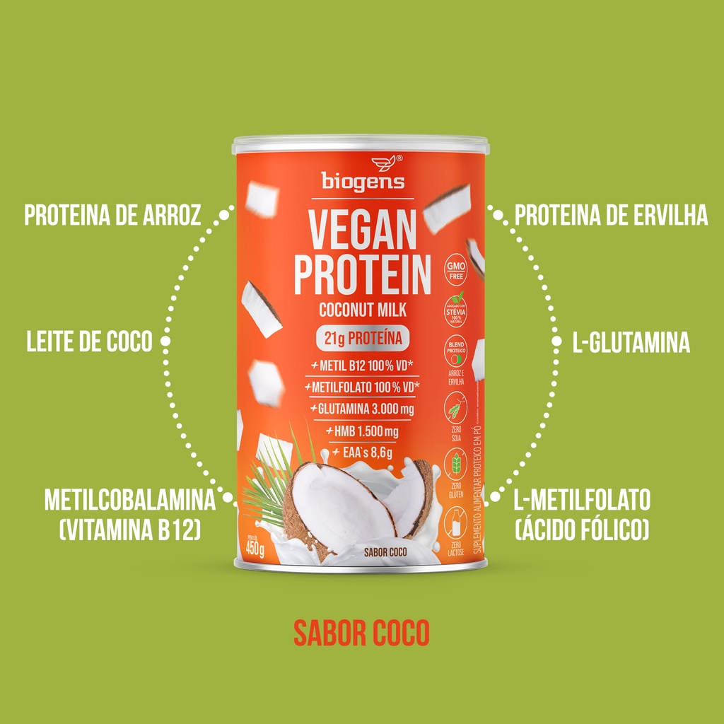 Vegan Protein Biogens é um suplemento inigualável para sua rotina de treinos. Com um gostinho delicioso de coco, é a combinação das duas melhores proteínas de origem 100% vegetal - arroz e ervilha - com o leite de coco em pó, que garante uma cremosidade e sabor realmente incomuns. Foi formulada exclusivamente fornecer tudo o que um estilo de vida vegano pede, totalmente livre de crueldade animal, a Vegan Protein Biogens entrega 21g de proteína, 100% do valor diário recomendado de Metil B12 (forma biodisponível de vitamina B12) e Metilfolato (forma biodisponível de ácido fólico), além de 3g de Glutamina e 1,5g de HMB (hidroxi metilbutirato de cálcio). Vegan Protein Biogens tem ZERO lactose, soja e glúten, sendo perfeita para os alérgicos e/ou intolerantes a essas substâncias. E tem mais, é 100% livre de Organismos Geneticamente Modificados (GMO Free) e de açúcares, pois é adoçada com Stevia. Cada pessoa tem suas preferências e objetivos, o papel da Biogens é criar produtos que atendam a todos vocês! Por isso adicionamos na fórmula da nossa Vegan Protein toda a suplementação que é indispensável para a saúde do público vegetariano estrito. O primeiro componente especial é a Metil B12, que é a forma ativa da cobalamina. É a formulação biodisponível da vitamina no organismo, que dispensa metabolização e favorece a absorção rápida e eficaz. Apesar do organismo armazenar alguma quantidade de B12, quando não há reposição, esta reserva se esgota (cerca de 3 a 5 anos sem reposição), já que o corpo não é capaz de produzi-la, por isso, é necessário o consumo de alimentos ricos em vitamina B12 ou de suplementação. Essa vitamina auxilia na formação de células vermelhas do sangue, no funcionamento do sistema imune, no metabolismo energético, no metabolismo dos carboidratos, proteínas e gorduras, no metabolismo da homocisteína além de auxiliar no processo de divisão celular. A deficiência de vitamina B12 no organismo humano pode vir a gerar mudanças de ordem psiquiátrica, neurológica, hematológica, e gastrintestinal, podendo assim ser considerada a mais importante dentre as vitaminas do complexo B. O segundo ingrediente adicionado foi a Metilfolato, que é a forma já biodisponível do ácido fólico, ou seja, a molécula de ácido fólico que passou pelo processo de metilação. Ácido fólico é uma vitamina do complexo B, mais especificamente a B9. É um elemento essencial para todas as pessoas, pois participa em diversos processos no organismo, mas não é produzido pelo corpo e precisa ser adquirido via alimentação ou suplementação. Essa vitamina auxilia na formação do feto durante a gravidez, na síntese de aminoácidos, no processo de divisão celular, no funcionamento do sistema imune, no metabolismo da homocisteína, na formação das células vermelhas do sangue. O terceiro elemento dessa fórmula é a glutamina, que é um aminoácido não essencial, ou seja, é sintetizado pelo nosso corpo. Está presente em abundância no organismo e fica disponível em sua forma livre no plasma, além de ser o aminoácido mais abundante no tecido muscular. É de extrema importância para diversos processos metabólicos, o que inclui a síntese proteica. No entanto, quando o corpo passa por condições como exercícios de alta intensidade, dietas restritas, cirurgias ou até mesmo alguma doença crônica, a síntese deste aminoácido não é suficiente para suprir a demanda do organismo. Nesse caso, podem ocorrer problemas como lentidão na produção endógena e enfraquecimento do sistema imunológico. Por isso, a suplementação de glutamina torna-se uma alternativa para aprimorar funções metabólicas e garantir o aporte nutricional. E por fim mas não menos importante, o HMB (B-hidroximetilbutirato, ou beta-hidroxy beta-metilbutirato) é um metabólito produzido pelo nosso corpo a partir da leucina, que age como um anticatabólico e ajuda no processo de recuperação muscular. A suplementação de HMB diária oferece efeitos positivos para quem treina, pois atua como um estimulador de força e ajuda o organismo na produção de adaptações ao treino, principalmente nas fases de alta intensidade. A sua ação anticatabólica pode auxiliar no aumento e na prevenção da perda de massa magra, além da sua capacidade regenerativa após os exercícios. Ingredientes Proteína isolada de ervilha, proteína isolada de arroz, leite de coco vegano em pó, L-glutamina, hidroximetiloutiratto (HMB), metilcobalamina (vitamina B12), L-metilfolato de cálcio (ácido fólico), estabilizantes goma guar e goma xantana, aroma idêntico ao natural de coco, edulcorantes naturais eritritol e glicosídeos de steviol (stevia). NÃO CONTÉM GLÚTEN. NÃO CONTÉM LACTOSE. Suplemento Alimentar dispensado de registro conforme Resolução RDC nº 240/2018.