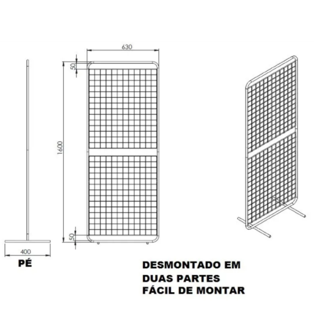 1 Biombo de Chão Aramado + 40 Ganchos Para Tela 10cm Fácil de Montar Dividido em duas partes Expositor ideal para exposição de produtos. (Feiras) Para Produtos LEVES, e sempre equilibrando peso dos dois lados para não tombar. Cores: Branco ou Preto Medidas Altura: 1,60 mts (montado) Largura: 63 cm Profundidade: 40 cm Pintura eletrostática