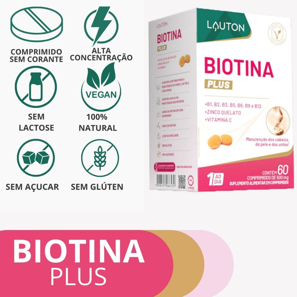 Biotina Premium com B1 B2 B3 B5 B6 B9 B12, C e Zinco Quelato - 60 Capsulas Concentradas Lauton - Cabelo, Pele e Unha