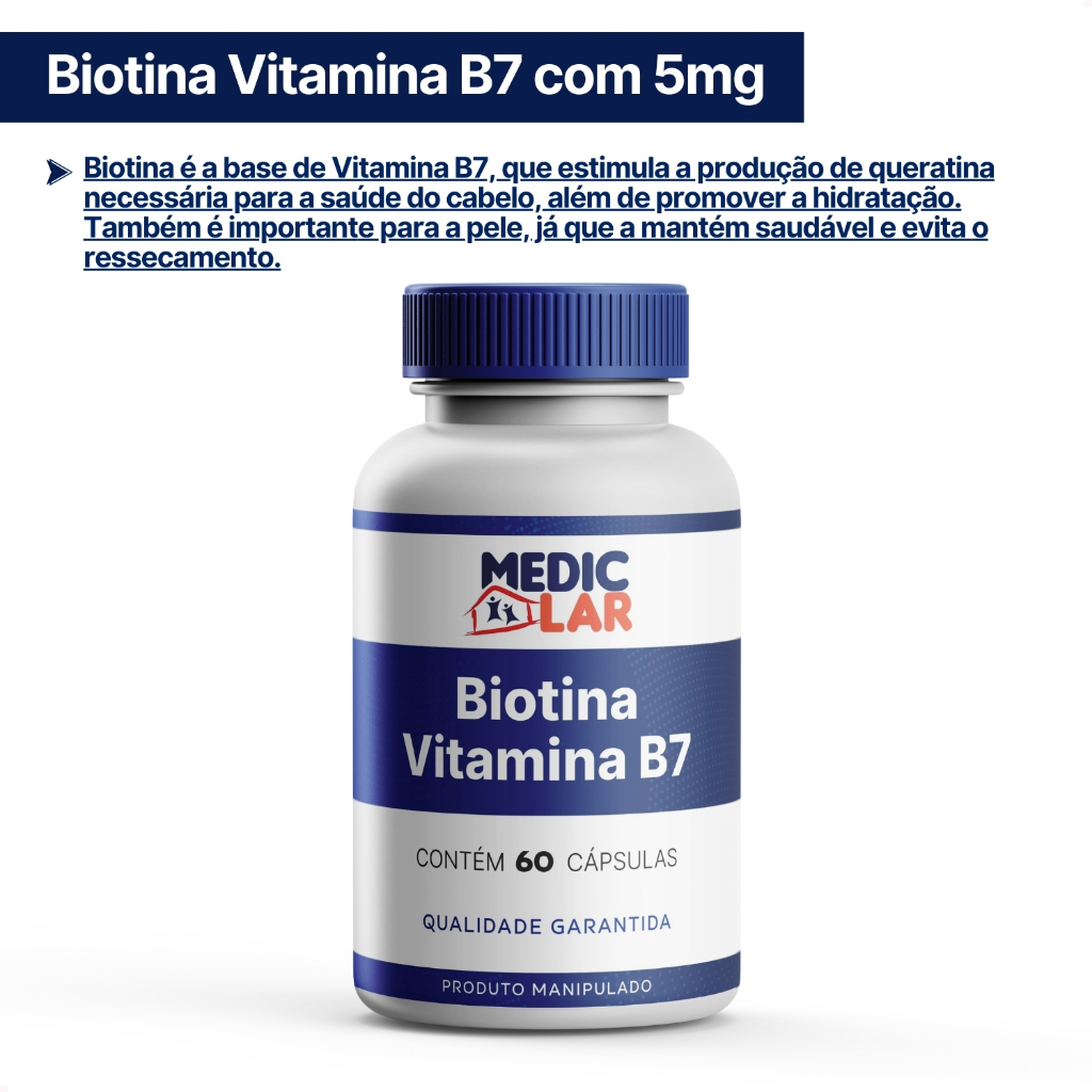 COMPOSIÇÃO (cada 1 cápsula contém): Biotina 5mg ou 10mg Excipiente q.s.p 1 cápsula SUGESTÃO DE USO: Tomar 1 cápsula ao dia ou conforme orientação de um profissional habilitado. VALIDADE: 6 meses