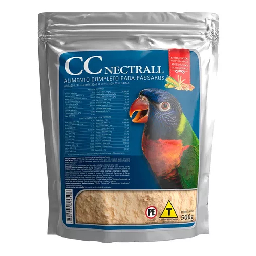 CC – NECTRALL é um alimento em pó, especialmente formulado para a alimentação de Lories adultos e Sairas. Sua fórmula exclusiva Biotron® é composta por frutas em pó (banana e maçã), farinha de soja micronizada, farelo de soja, clara de ovo em pó, dextrose, e enriquecida com aminoácidos, vitaminas e minerais, que quando combinados oferecem às aves todos os nutrientes necessários para uma alimentação saudável e equilibrada. SUGESTÃO DE CONSUMO: Pode ser fornecido à vontade, misturando uma parte de CC -NECTRALL com três partes de água em comedouros limpos. É recomendado retirar as sobras e limpar os comedouros diariamente, a fim de evitar possíveis contaminações. CC-NECTRALL é um alimento 100% completo, que pode ser utilizado como fonte alimentar única ou como suplemento alimentar. Deve ser conservado em local seco e protegido da luz. DIFERENCIAIS DE CC – NECTRALL: – Dextrose e néctar de frutas: fonte energética e incremento em palatabilidade. – Clara de ovo em pó: rica em albumina, proteína de alto valor biológico.