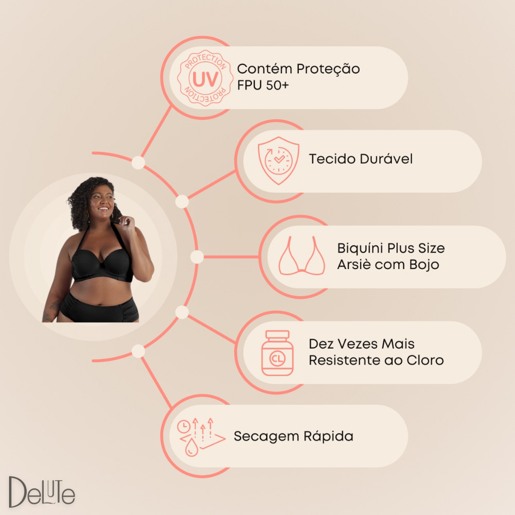 Biquíni Plus Size com Bojo Tecido Texturizado Ref: AS5094 O biquíni Arsiè com aro apresenta um design com laterais largas e bojo, além de alças ajustáveis e fechamento por laços. O top estruturado se ajusta bem a diversos tamanhos de busto, seguindo as tendências da moda praia com seu tecido texturizado. É uma excelente escolha para quem procura conforto, estilo e segurança durante o verão, sendo um modelo confortável, moderno e popular entre o público feminino por se ajustar perfeitamente ao corpo. - Modelagem anatômica para um ajuste ideal. - Encaixe perfeito no corpo. - Alças reguláveis. - Inclui bojo. Composição: Tecido: Poliéster 85% Forro: Poliéster 90%