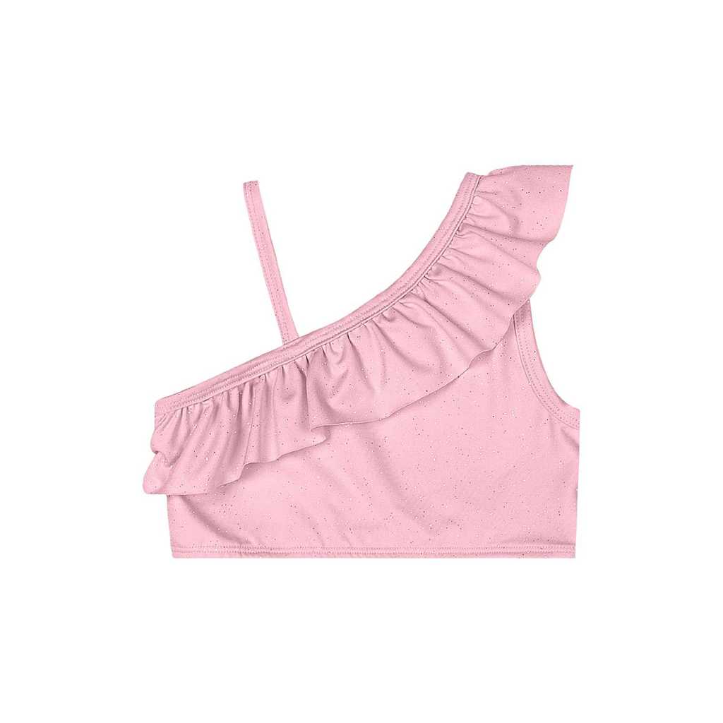 Biquíni infantil feminino com design moderno e delicado, confeccionado em malha com brilho (glitter) e proteção solar FPS 50+. A peça traz top com alça assimétrica e babado franzido, proporcionando charme extra. A calcinha tem modelagem tradicional com elástico confortável. Com forro interno em microfibra, o conjunto garante segurança, conforto e visual encantador para os dias de sol.Tecido: Malha poliéster FPS +50 e poliésterComposição: Calcinha: 90% Poliéster e 10% Elastano | Top: 90% Poliéster e 10% ElastanoModelagem: JustaComprimento Mangas: CurtaModelo Mangas: AlçasComprimento: CurtoForro: SimCintura: MédiaDecote/Gola: RedondoInformações Extras: Possui estampa lisaInformações Extras: Possui elástico na cinturaInformações Extras: Possui babados