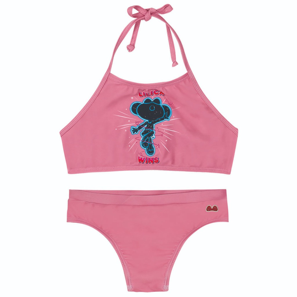 Biquíni para menina confeccionado em malha sintética com elastano sublimada e forro em poliamida. O top possui modelagem frente única, com alça para amarração no pescoço e fecho nas costas, lettering da marca e estampa frontal com a silhueta da personagem. A calcinha conta com cós duplo com elástico, detalhe com o laço da personagem e estampa lisa. Perfeito para garantir muito estilo e diversão nos dias de sol, sua pequena vai adorar! Aposte! • Biquíni com top e calcinha • Amarração no pescoço • Fecho nas costas • Lettering • Estampa com a personagem • Elástico no cós • Malha sintética com elastano