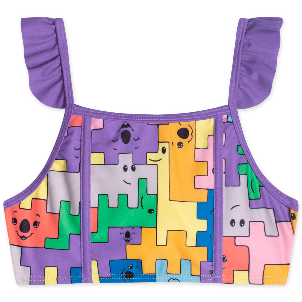 Biquíni para menina confeccionado em malha sintética com elastano sublimada e forro em poliamida. O top possui alças, detalhes em babados e estampa em toda a peça com blocos coloridos que formam alguns animais. A calcinha conta com elástico no cós, detalhe em babados e estampa em toda a peça igual ao top. Aposte! Sua pequena vai ficar ainda mais linda! • Biquíni • Possui alças • Estampa em blocos coloridos • Detalhe em babados • Elástico no cós • Malha sintética com elastano