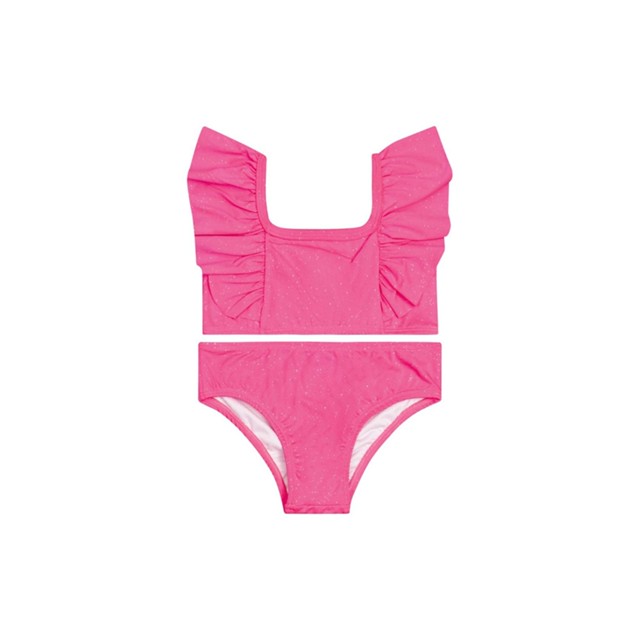 Biquíni infantil para menina, confeccionado em malha FPS +50 com um toque de glitter, que proporciona proteção solar. O top possui alças e encantadores detalhes de babado, adicionando um toque delicado ao visual. Ambas as peças contam com forro em poliéster, garantindo conforto e suavidade.Tecido: Malha FPS +50Composição: Calcinha: 93% Poliéster 7% Elastano / Forro: 90% Poliéster 10% Elastano | Top: 93% Poliéster 7% Elastano / Forro: 90% Poliéster 10% ElastanoModelagem: JustaComprimento Manga: CurtaModelo Manga: Com babadosComprimento: CurtoForro: SimCintura: Média