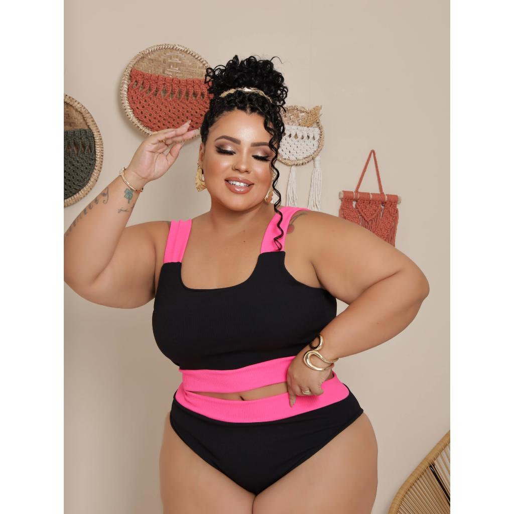 Biquíni Plus Size Tropical Feminino Cintura Alta Top de Academia Efeito Lipo na Barriga