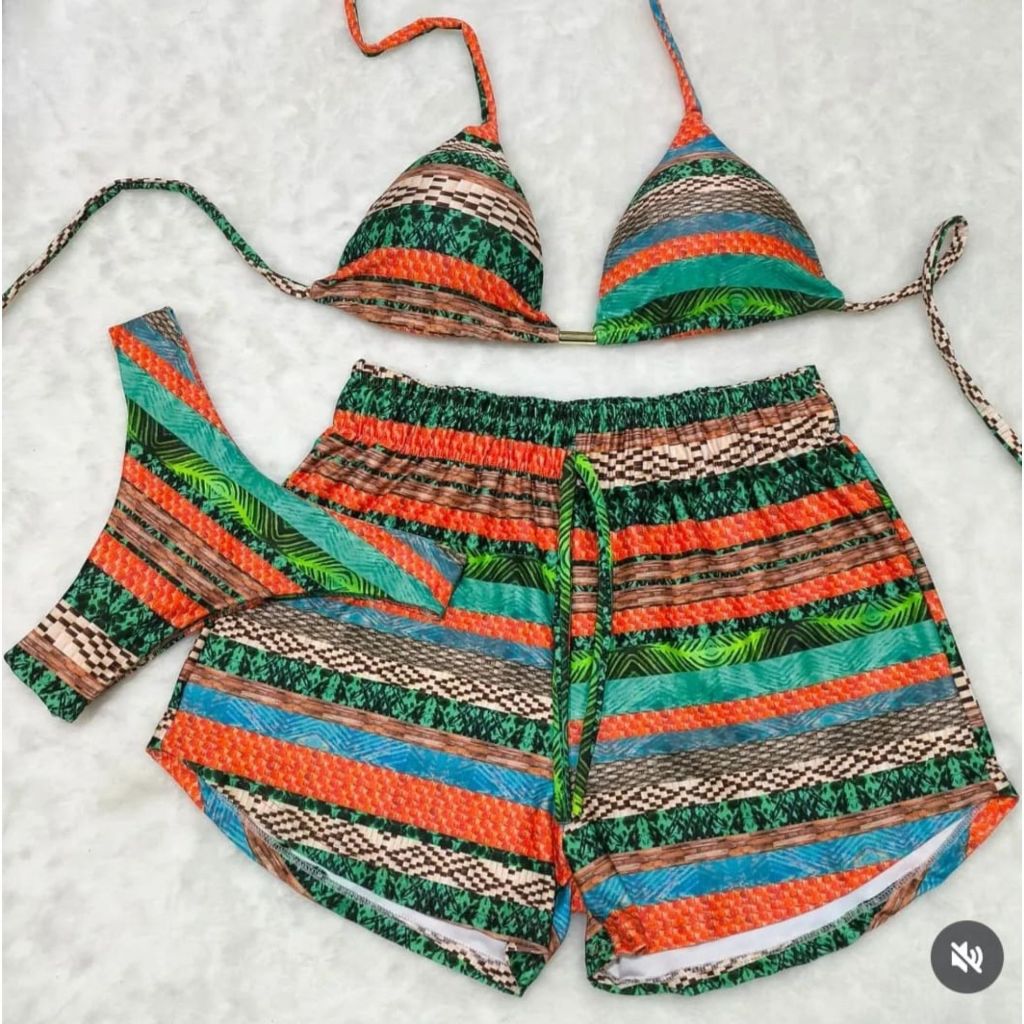 ****** ENVIO IMEDIATO******* TODOS OS PEDIDOS REALIZADOS ATÉ AS 11H SÃO ENVIADOS NO MESMO DIA. (Segunda a sexta) POR FAVOR, LEIA BEM A TABELA DE TAMANHO ANTES DE DECIDIR O TAMANHO DESEJADO. Conjunto de biquini elegante composto de três peças, perfeito para quem busca conforto, estilo e versatilidade. Feito com tecido poliamida, ele proporciona uma sensação suave e agradável ao toque, além de oferecer ótima elasticidade para se ajustar perfeitamente ao corpo. Esse kit inclui um top de modelagem triangular com alças ajustáveis uma calcina forrada que traz uma sensação de conforto e confiança. Além disso esse conjunto tem uma saída de praia estilosa e perfeita pra complementar o look, esse saída de praia é um short com caimento fluído, ideal para desfrutar de momentos relaxantes à beira-mar com muito charme. Material: Confeccionada em tecido poliamida, proporciona uma sensação suave e confortável contra pele. Design: Abraçando a versatilidade, o conjunto apresenta uma mistura de estampas chamativas e cores sólidas, permitindo que você expresse o seu estilo único sem esforço. O biquíni é tanto fashion quanto funcional, tornando-o a escolha perfeita para dias na praia ou momentos relaxantes à beira da piscina. Tamanhos: encontre ajuste perfeito que atende todos os tipos de corpo, incluindo M (veste 38-40) G (veste 42-44) GG (veste 44-46)