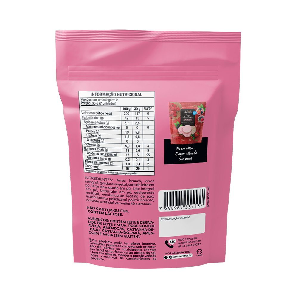 O biscoito de arroz da Naturatta com cobertura de frutas vermelhas é uma escolha deliciosa para um lanche equilibrado. Feito com ingredientes de alta qualidade, este biscoito é uma opção que atende a diversas necessidades alimentares: Sem glúten: Ideal para celíacos e pessoas com sensibilidade ao glúten. Zero açúcar: Perfeito para quem quer reduzir a ingestão de açúcar. Com uma cobertura de frutas vermelhas, este biscoito oferece uma combinação de sabores irresistível. A textura crocante do arroz se une ao sabor fresco e levemente ácido das frutas vermelhas, proporcionando uma experiência sensorial única. Este produto é uma escolha saudável e saborosa para qualquer momento do dia, permitindo que você satisfaça seus desejos de forma consciente. INGREDIENTES: Arroz branco, arroz integral, gordura vegetal, soro de leite em pó, leite desnatado em pó, leite integral em pó, beterraba em pó, edulcorante maltitol, emulsificante lecitina de soja, estabilizante poliglicerol polirricinoleato, corante artificial vermelho 40 e aromas. ALÉRGICOS: CONTÉM LEITE E DERIVADOS DE LEITE E SOJA. PODE CONTER AVELÃ, AMÊNDOAS, CASTANHA-DE-CAJU, CASTANHA-DO-PARÁ, AMENDOIM E AVEIA (SEM GLÚTEN). NÃO CONTÉM GLÚTEN. CONTÉM LACTOSE. SEM GLÚTEN, ZERO ADIÇÃO DE AÇÚCARES, BAIXO EM SÓDIO.