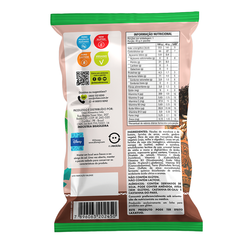 Desfrute de uma experiência única com o biscoito de chocolate da Moana. Onde a diversão de achar seus personagens favoritos nos biscoitos se junta com o sabor incrível do chocolate e uma textura crocante, trazendo a magia da Disney para seus lanches de forma deliciosa. INGREDIENTES: Féculas de mandioca e de batata, farinha de arroz, amido, gordura vegetal, fibra de soja não transgênica, óleos vegetais (soja, milho e algodão), cacau em pó, farinha de soja não transgênica, edulcorantes xarope de maltitol, maltitol e sucralose, emulsificantes lecitina de soja, estearoil lactato de sódio e mono e diglicerídeos de ácidos graxos, espessante goma xantana, Vitamina A (Acetato de retinol), Vitamina C (Ácido Ascórbico), Vitamina D (Colecalciferol), Vitamina B3 (Nicotinamida), Ácido Fólico (Ácido N-pteroil-L-glutâmico), Vitamina B12 (Cianocobalamina), Ferro (Pirofosfato férrico), Zinco (Sulfato de zinco monoidratado), fermento químico bicarbonato de amônio, acidulante ácido cítrico e aromas. ALERGÊNICOS: CONTÉM DERIVADOS DE SOJA. PODE CONTER AMÊNDOA, AVEIA (SEM GLÚTEN), CASTANHA-DE-CAJU E CASTANHA-DO-PARÁ. NÃO CONTÉM GLÚTEN. NÃO CONTÉM LACTOSE. SEM GLÚTEN, ZERO ADIÇÃO DE AÇÚCARES, ZERO LACTOSE, VEGANO, MIX DE VITAMINAS E MINERAIS.