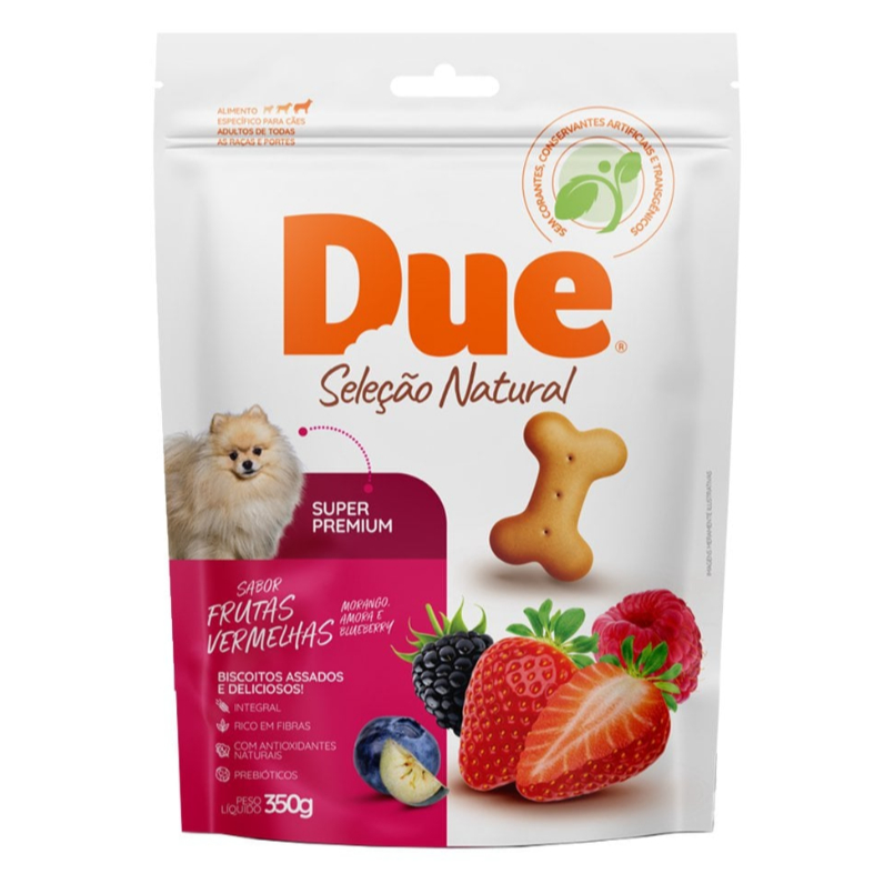 OBiscoito Due Seleção Natural Frutas Vermelhas para Cães Adultos 350g É um alimento super premium, específico para cães adultos de todas as raças e portes. Assado e muito saboroso, elaborado com frutas vermelhas como morango, amora e blueberry oBiscoito Due Seleção Natural Frutas Vermelhas para Cães Adultos é a opção perfeita para alegrar o dia-a-dia do seu pet, além de contribuir para a sua saúde e bem-estar. Biscoito integral; Rico em fibras; Com antioxidantes naturais; Prebióticos.