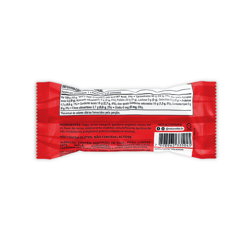 Experimente o delicioso Biscoito de Tapioca com Cobertura de Chocolate Amargo da Naturatta, uma opção irresistível e equilibrada para o seu lanche. Feito com ingredientes de alta qualidade, esse biscoito atende a diversas necessidades alimentares: Sem glúten: Ideal para celíacos e pessoas com sensibilidade ao glúten. Zero açúcar: Perfeito para quem quer reduzir a ingestão de açúcar. Sem Lactose: Uma escolha adequada para quem segue uma dieta restritiva, sem produtos de origem animal. Livre de conservantes: Fabricado sem conservantes artificiais, garantindo uma opção mais natural. Com uma cobertura de chocolate amargo, o biscoito de tapioca oferece uma combinação de sabores inigualáveis. O crocante do arroz integral se mistura ao sabor intenso e ligeiramente amargo do chocolate, criando uma experiência única e prazerosa. Uma excelente escolha para quem busca uma opção saudável e saborosa em qualquer momento do dia. INGREDIENTES: Sagu, arroz integral, gordura vegetal, cacau em pó, liquor de cacau, edulcorante maltitol, emulsificante lecitina de soja, estabilizante poliglicerol polirricinoleato e aromas. ALÉRGICOS: CONTÉM DERIVADO DE SOJA. PODE CONTER LEITE, AVELÃ, AMÊNDOAS, CASTANHA-DE-CAJU, CASTANHA-DO-PARÁ, AMENDOIM E AVEIA (SEM GLÚTEN). NÃO CONTÉM GLÚTEN. NÃO CONTÉM LACTOSE. SEM GLÚTEN, ZERO ADIÇÃO DE AÇÚCARES, ZERO LACTOSE, VEGANO, BAIXO EM SÓDIO.