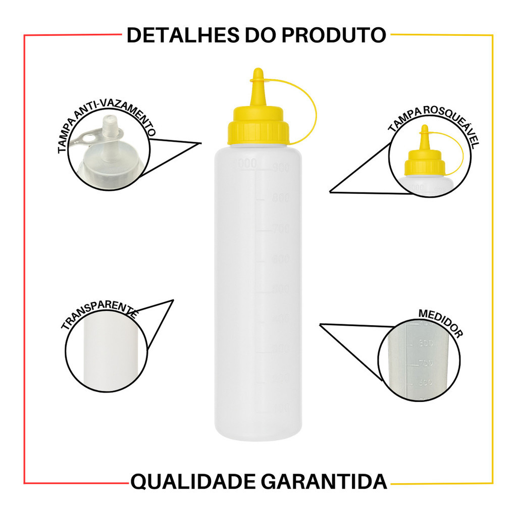 BISNAGA TRANSPARENTE 1 LITRO COM MEDIDOR TAMPA AMARELA As bisnagas para condimentos são feitas com plástico especial para não contaminar os alimentos e molhos. Leves e resistentes próprios para uso doméstico ou profissional. -Com medidor de dosagem; -Cada bisnaga com 1000 ML; -Pode ser levado ao congelador; -O líquido só sai quando a bisnaga é pressionada; -Rosca firme e precisa: as tampas ficam firmes e não se soltam, evitando surpresas desagradáveis; -Excelente para usos em lanchonetes, hamburguerias, pastelarias, restaurantes em geral;