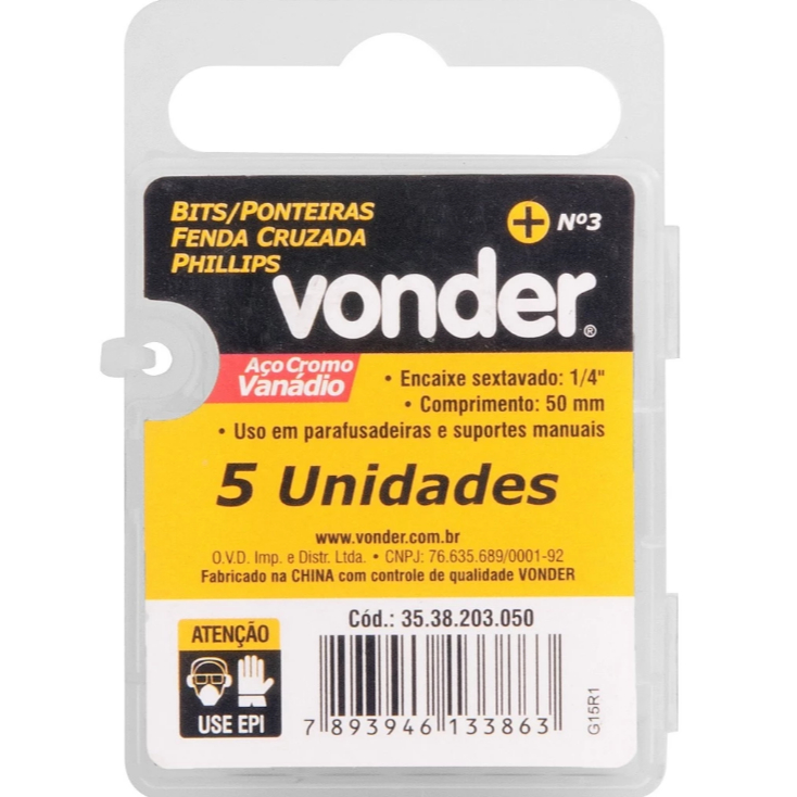O Jogo de Bits Phillips Nº3 50mm N350MM foi desenvolvido para oferecer potência, precisão e durabilidade em aplicações que exigem alto torque e alcance ampliado. Fabricado em aço especial temperado, garante resistência superior e longa vida útil, mesmo sob uso intenso. Com 50mm de comprimento, permite alcançar parafusos em locais mais profundos, mantendo encaixe firme e seguro. Compatível com parafusadeiras elétricas, manuais e pneumáticas, é a escolha ideal para profissionais que buscam desempenho e confiabilidade. Características Técnicas: Modelo: N350MM Tipo de ponta: Phillips (cruzada) Encaixe: 1/4" (sextavado) Tamanho: 50 mm Número: Nº3 Medida da ponta: 5/16 Material: Aço especial temperado Quantidade: 5 peças Diferenciais: Maior alcance e acessibilidade com 50mm de comprimento Alta resistência ao desgaste e deformação Encaixe preciso que evita o espanar de parafusos Ideal para uso profissional e contínuo Compatível com parafusadeiras e chaves de impacto Vantagens: Transmissão eficiente de torque Excelente fixação e segurança no trabalho Longa durabilidade mesmo em uso intenso Ferramenta essencial para montagens de alto desempenho Aplicações: Indicado para montagens automotivas, industriais, marcenaria e manutenção geral, proporcionando trabalho preciso, eficiente e com acabamento profissional.