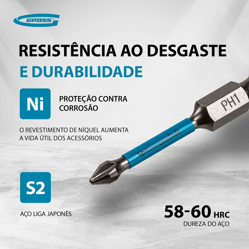 Bits de Torção PH1 x 50 mm Gross 1149255, com 10 peças, é especialmente desenvolvido para facilitar a montagem e desmontagem de conexões roscadas usando uma Chave de Impacto. Este conjunto se torna uma ferramenta essencial em uma variedade de contextos, como construção, mecânica, montagem, oficinas mecânicas e reparos domésticos. Uma inovação chave desses bits é a zona de torção, que é projetada para flexionar sob carga. Isso permite uma distribuição uniforme do impacto e reduz significativamente o risco de danos à ranhura do bit. Vantagens Detalhadas: Design Inteligente: A zona de torção nos Bits de Torção PH1 x 50 mm Gross 1149255 permite o uso com chaves de fenda de impacto em superfícies extremamente duras sem o risco de quebrar o bit. Essa funcionalidade não apenas aumenta a vida útil do bit, mas também assegura eficácia em aplicações desafiadoras. Material de Alta Qualidade: Feitos com aço japonês S2 ligado, estes bits oferecem resistência notável ao desgaste, estendendo sua vida útil significativamente. A escolha desse material de alta qualidade garante um desempenho confiável sob uso contínuo. Resistência ao Desgaste: A tempera dos bits até uma dureza de 58-60 HRC melhora sua resistência à deformação. Esta propriedade é crucial para manter a precisão e eficácia dos bits ao longo do tempo. Fixação Confiável dos Bits: As ranhuras dos bits são magnetizadas, garantindo que a fixação permaneça segura. Isso permite ao usuário manipular o material fixado com uma mão livre, elevando a eficiência do trabalho e a segurança no ambiente de trabalho. Proteção Contra Falsificações: O anel azul com o logotipo da marca Gross serve como um selo de autenticidade, protegendo os consumidores contra falsificações e assegurando a originalidade do produto. Armazenamento Conveniente: A embalagem em blister com um gancho europeu oferece uma solução prática para o armazenamento e a organização dos bits, permitindo que sejam facilmente pendurados em um suporte. Esta solução de armazenamento mantém a área de trabalho organizada e os bits prontamente acessíveis. 10 Bits no Jogo: Este conjunto de 10 peças é ideal para atender às necessidades de uma pequena equipe de produção, garantindo a disponibilidade de bits de reposição para manter a continuidade do trabalho sem interrupções. Bits de Torção PH1 x 50 mm Gross 1149255 é uma escolha primordial para profissionais que valorizam a eficiência, durabilidade e precisão em suas ferramentas de trabalho. Com inovações como uma zona de torção para uso em aplicações exigentes, material de alta qualidade para maior durabilidade, e um design inteligente que garante fixação confiável, estes bits são indispensáveis para uma ampla gama de tarefas. A combinação de eficiência, durabilidade, e conveniência faz deste conjunto de 10 bits uma adição valiosa a qualquer conjunto de ferramentas profissionais, oferecendo uma solução confiável e de longa duração para as demandas diárias de trabalho.