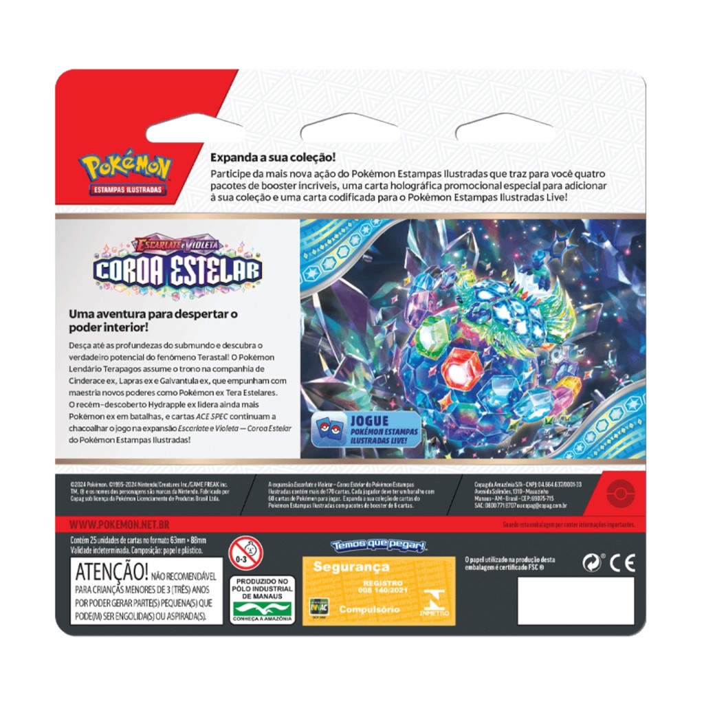 Destaque sua coleção com o incrível Blister Pokémon Coroa Estelar! Escolha entre Latias ou Tinkaton e tenha em mãos uma seleção estratégica para fortalecer seu baralho e conquistar vitórias ainda mais épicas no universo Pokémon. ATENÇÃO: Verifique a opção antes de finalizar a compra. Será enviado apenas o personagem escolhido. Sobre o produto: - Marca: Copag. - Linha: Escarlate e Violeta Coroa Estelar. - Blister Quádruplo Pokémon – Latias ou Tinkaton. - Contém 4 pacotes de booster da coleção Escarlate e Violeta Coroa Estelar. - 1 carta holográfica promocional de Latias ou Tinkaton. - 1 carta codificada para o Pokémon Estampas Ilustradas Live. - 25 cartas prontas pra jogar. Indicado para: Colecionadores e fãs do universo Pokémon, especialmente de Latias ou Tinkaton. Jogadores que desejam impulsionar suas estratégias com um blister exclusivo. Modo de uso: - Abra os boosters com cuidado - Analise as cartas obtidas e fortaleça seu baralho com novas combinações. - Utilize o código incluso para jogar online no Pokémon Estampas Ilustradas Live. Precauções: - Não recomendado para crianças menores de 3 anos. - Crianças pequenas devem manusear com supervisão de um adulto. Com boosters da poderosa coleção Coroa Estelar, este blister é a escolha certa para quem busca cartas exclusivas, estratégias inéditas e ainda mais emoção em cada duelo. Ficou com alguma dúvida? Fale com a gente! Boas compras :)