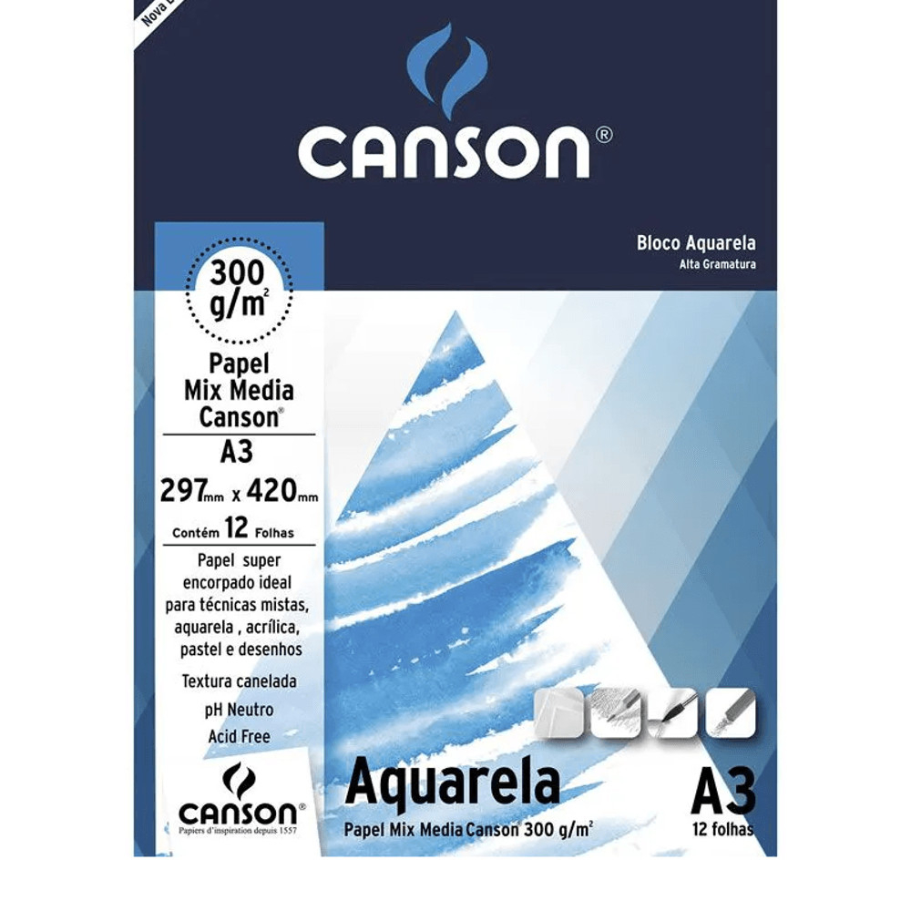Bloco Aquarela Canson A3 300g 12 Folhas Textura Fina Artístico Profissional Papel Livre de Ácido