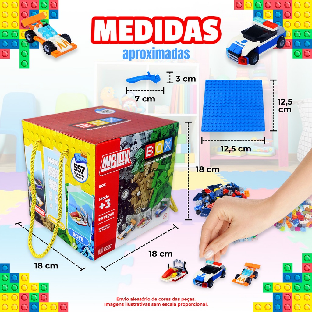 Explore a criatividade com o Kit Inblox Diversão, aprendizado e imaginação em um só brinquedo! Ideal para crianças a partir de 3 anos, o kit acompanha peças coloridas, compatíveis com LEG, permitindo montar carros, barcos, animais e muito mais. Inclui placa de base, separador de peças e manual com instruções ilustradas. Tudo vem em uma caixa com alça, fácil de carregar e armazenar! Estimula o raciocínio lógico e resolução de problemas Incentiva foco, concentração e criatividade Fortalece o vínculo entre pais e filhos com atividades em conjunto Cores vibrantes que aumentam o tempo de atenção e envolvimento Medidas aproximadas da caixa: 18 x 18 x 18 cm Material: Plástico resistente e seguro, com certificação INMETRO. Presente perfeito para desenvolver habilidades motoras, cognitivas e sociais desde cedo! Enviaremos conforme a variação cores e modelos variados, garantindo sempre uma experiência divertida e única. FAQ – Perguntas Frequentes Qual variação vou receber? Você receberá exatamente o modelo selecionado no menu de variações no momento da compra. As medidas são de qual variação? As medidas informadas pertencem à variação principal exibida nas imagens, servindo apenas como referência. As cores mudam conforme a variação? Sim. As placas e blocos podem apresentar diferenças de tonalidade ou composição, conforme a opção escolhida. O conteúdo muda conforme a variação? Sim. Cada variação possui seu conjunto específico de peças, blocos ou placas, exatamente como mostrado nas imagens. As placas são compatíveis com LEGO? Sim, conforme apresentado nas imagens, as placas são compatíveis com blocos do mesmo padrão.