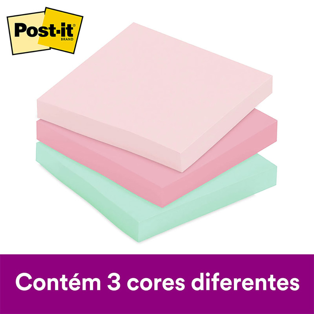 Nova coleção dos famosos blocos de notas adesivas Post-it em packs com mais variedades de cores. Suas ideias e sonhos só começam a tomar forma quando sua caneta encontra o papel. Porque quando você coloca suas ideias no papel, faz delas um pouco mais reais. Notas Post-it são as melhores parceiras neste ponto de conexão. É a transformação de seus pensamentos e os murais coloridos de Notas Post-it que iluminam as ideias de todos. Suas folhas são reposicionáveis, ou seja, possuem Super Adesivo Post-it, que permite que sejam retirados e recolocados, sem danificar papéis ou outras superfícies, sem deixar resíduos do adesivo e sem perder a eficiência na fixação. Sua embalagem é transparente e permite que você visualize a cor real do produto, além de protegê-lo, fazendo com que chegue sem nenhuma sujeira ou mancha em suas mãos. Tenha os blocos de notas adesivas Post-it sempre à mão em seu escritório ou em casa, dentro de seu caderno, da bolsa, próximo ao telefone, cabeceira da cama ou onde mais quiser. Detalhes: - Tamanho: 76 x 76 mm - Contém: 3 blocos adesivo com 90 folhas cada - Cores: Rosa milênio, damasco e azul céu - Ideal para anotar compromissos, tarefas, recados e tudo mais que você precisar.