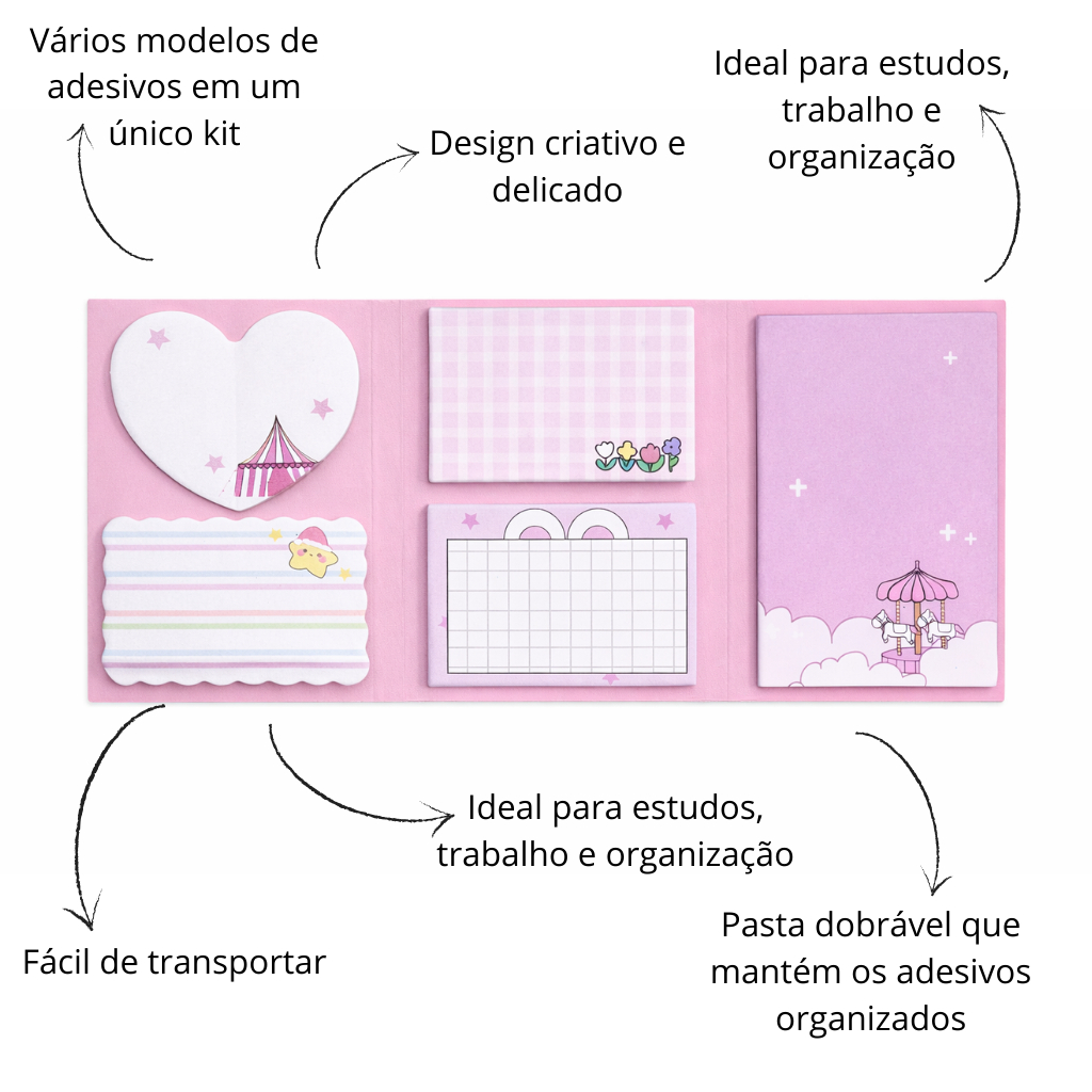 DESCRIÇÃO DO PRODUTO Bloco de notas adesivas estilo Post-it com design fofo e criativo, ideal para organizar tarefas, marcar páginas de livros, fazer lembretes ou decorar cadernos e planners. O kit vem dentro de uma pasta organizadora dobrável que reúne vários modelos de bloquinhos adesivos de diferentes tamanhos e formatos, facilitando o uso no dia a dia. Perfeito para estudantes, professores, escritório ou para quem gosta de papelaria criativa. DIFERENCIAIS DO PRODUTO • Vários modelos de adesivos em um único kit • Design criativo e delicado • Fácil de transportar • Ideal para estudos, trabalho e organização • Pasta dobrável que mantém os adesivos organizados CONTEÚDO DO KIT • 1 pasta organizadora • Vários blocos de notas adesivas estilo Post-it • Diferentes tamanhos e formatos de sticky notes Os modelos podem variar entre temas como astronauta, capivara, gato, carrossel e outros estilos fofos. CARACTERÍSTICAS Tipo: Bloco de notas adesivas / Sticky notes Material: Papel adesivo Formato: Pasta dobrável Uso: Escola, escritório, planner, agenda, estudos e organização INDICAÇÃO DE USO Ideal para: Organizar tarefas Marcar páginas de livros Criar lembretes Usar em planners e agendas Decorar cadernos