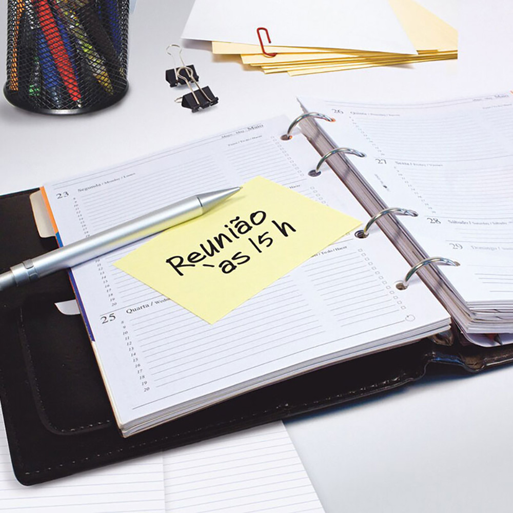O Bloco Adesivo Amarelo Post-it® foi inventado por um pesquisador da 3M em 1980 e, desde então, conquistou o mundo! Ideal para anotar compromissos, tarefas, recados e tudo mais que você precisar. Suas folhas são reposicionáveis, ou seja, possuem adesivo de qualidade 3M, que permite que sejam retirados e recolocados, sem danificar papéis ou outras superfícies, sem deixar resíduos do adesivo e sem perder a eficiência na fixação. Sua embalagem é transparente e permite que você visualize a cor real do produto, além de protegê-lo, fazendo com que chegue sem nenhuma sujeira ou mancha em suas mãos. Detalhes: - Tamanho: 76 x 76 mm - Ideal para anotar compromissos, tarefas, recados e tudo mais que você precisar - Reciclável, adesivo com base vegetal - Contém um bloco com 100 folhas.