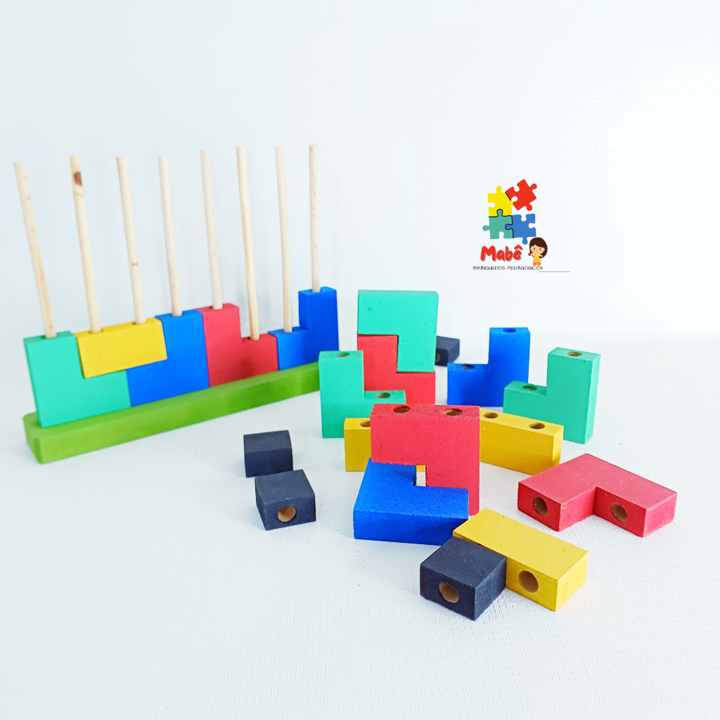 Blocos de Encaixes Vertical 25 Peças Coloridos em Madeira Jogo Educativo Tetris Brinquedo
