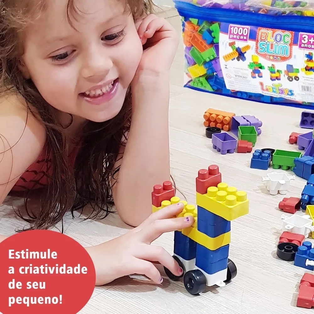 BLOCOS DE MONTAR 1000 PEÇAS E COM RODINHAS E MALETA PLÁSTICAIndicados para crianças a partir de 3 anos, esses blocos de altíssima qualidade com bordas totalmente arredondadas e ótimo encaixe que permite a montagem com muita facilidade. São super coloridos, atóxicos e com alto brilho! Aproveite que os blocos vêm acompanhados de rodinhas assim a imaginação das crianças vai além! Acondicionado em uma linda BOLSA de PVC cristal transparente com alça que além de ser linda, facilitará muito na hora de guardar os blocos.*Ideal para presentear as crianças de qualquer gênero e incrementar o espaço das escolas, clínicas e brinquedotecas.Não é um brinquedo com uma finalidade de montagem definida, então a criança pode construir inúmeros objetos com os blocos, desde casas até veículos e animais. Além de brincar, a criança estará desenvolvendo outras habilidades como planejamento, raciocínio lógico-matemático, a noção espacial, a criatividade, a coordenação motora fina entre outros. Com isso tudo, Ao brincar de faz de conta com blocos de montar, a criança estará inserida dentro de uma cultura MAKER pois estará desenvolvendo a solução de problemas na prática ao planejar, reconhecer e utilizar as peças.Trabalhamos em parceria com nossos clientes, desejamos que tenha a melhor experiência de compra nos dispondo totalmente ao atendimento pré e pós venda, orientando da melhor maneira.indicação: a partir dos 3 anos (sugerimos a supervisão de um adulto durante a brincadeira)Composição: PlásticoCertificado pelo INMETROCores sortidosTamanho das PeçasBloco 2 Pinos 1,2 x 2,5 x 2,1 CmBloco 4 Pinos 2,5 x 2,5 x 2,1 CmBloco 6 Pinos 3,7 x 2,5 x 2,1 CmBloco 8 Pinos 5,0 x 2,5 x 2,1 Cm