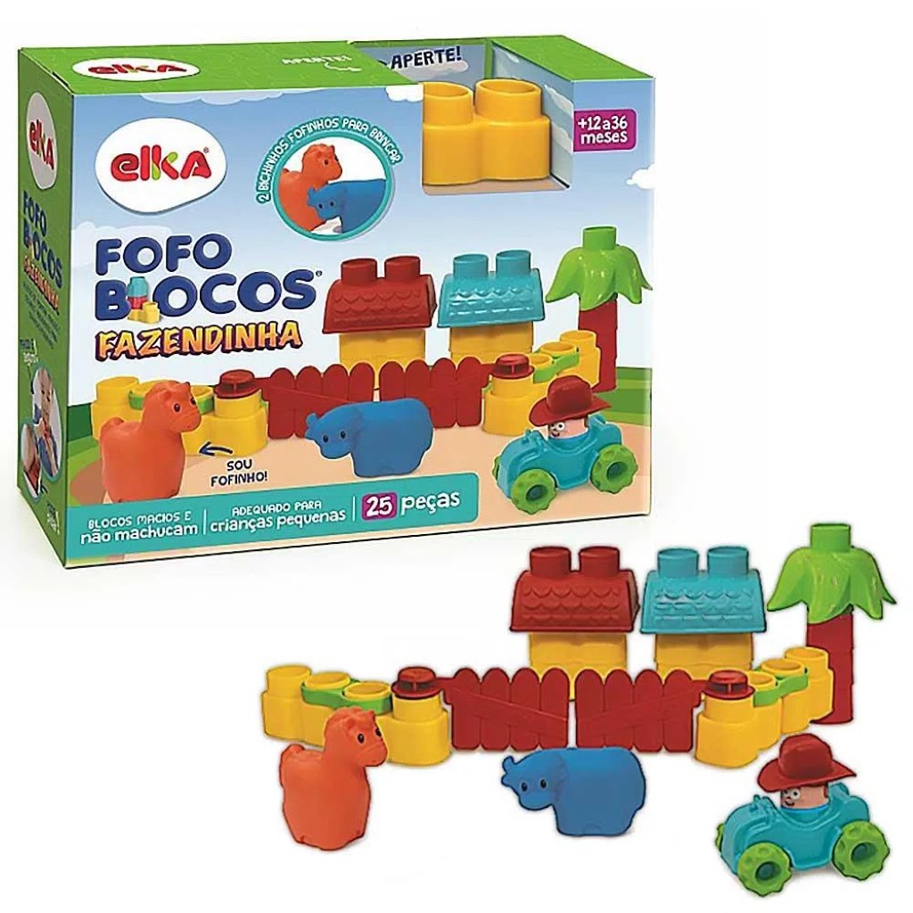 DESCRIÇÃO DO PRODUTO Os Blocos de Montar - Fofo Blocos Fazendinha - 25 Peças - Elka são macios, fofinhos e adequado para crianças pequenas. A brincadeira é encaixar, empilhar e montar. Pode pisar, sentar em cima que não machuca. É muito seguro. Acompanha 2 bichinhos fofinhos para brincar. Material atóxico. Recomendado para crianças a partir de 12 meses de idade. Contém 14 blocos, 2 animais, 1 trator, 2 cercas, 2 telhados, 2 conexões, 1 árvore e chapéu. CARACTERÍSTICAS TÉCNICAS Conteúdo da Embalagem: 14 blocos, 2 animais, 1 trator, 2 cercas, 2 telhados, 2 conexões, 1 árvore e chapéu Dimensões Aproximadas da Embalagem: 24 x 30 x 10,2cm (Altura x Largura x Comprimento/Profundidade) Material/Composição: Plástico Idade Mínima Recomendada: De 12 a 36 meses Marca: Elka Referência: 1093 Aviso: As informações e imagens divulgadas são de total responsabilidade do fabricante/fornecedor. APROVADO PELO INMETRO