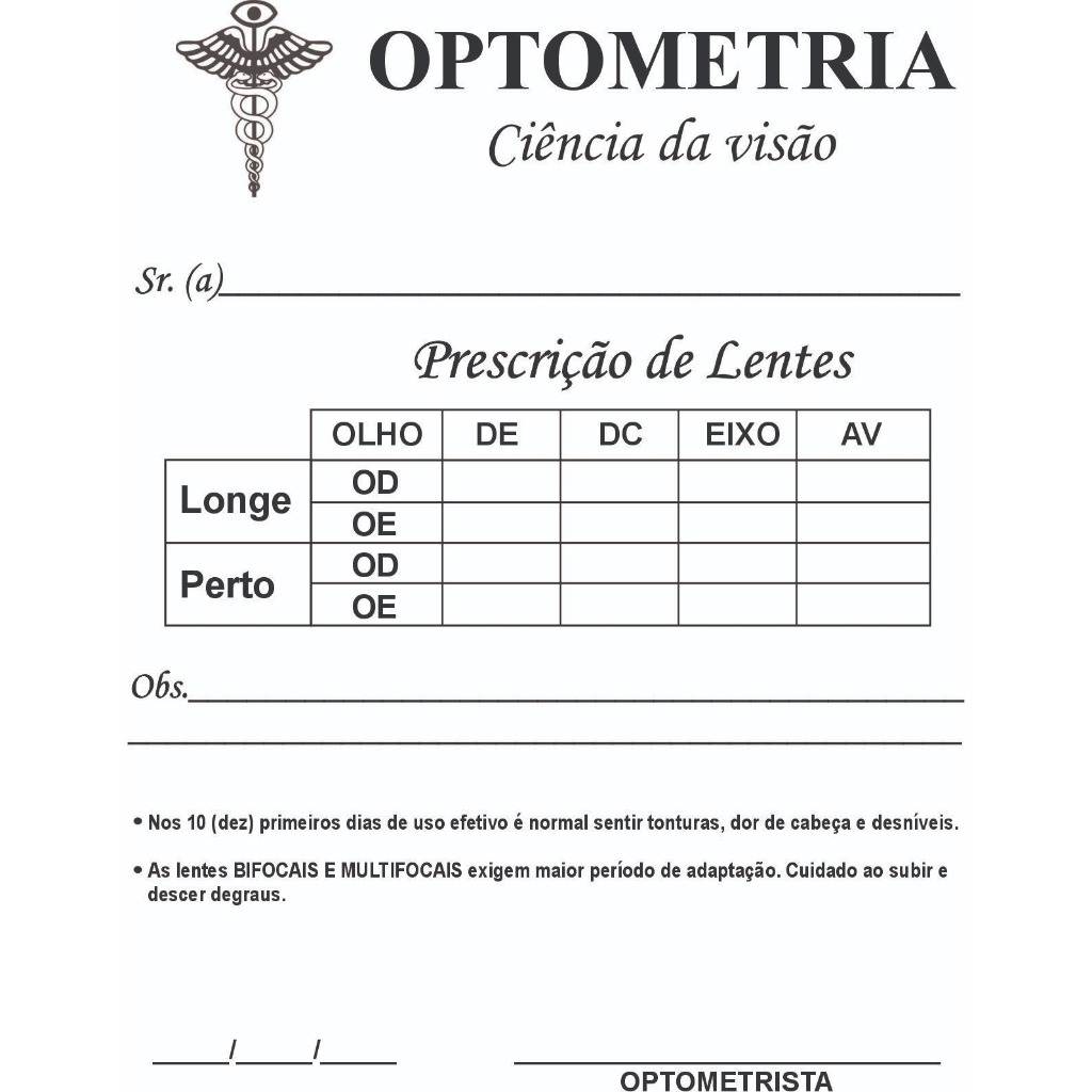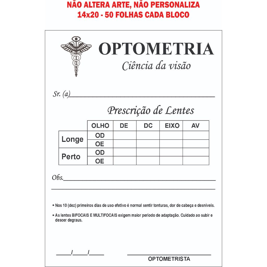 Blocos Receituário Ciência da Visão Optometria 14x20, 50 folhas cada bloco Papelaria Anotações