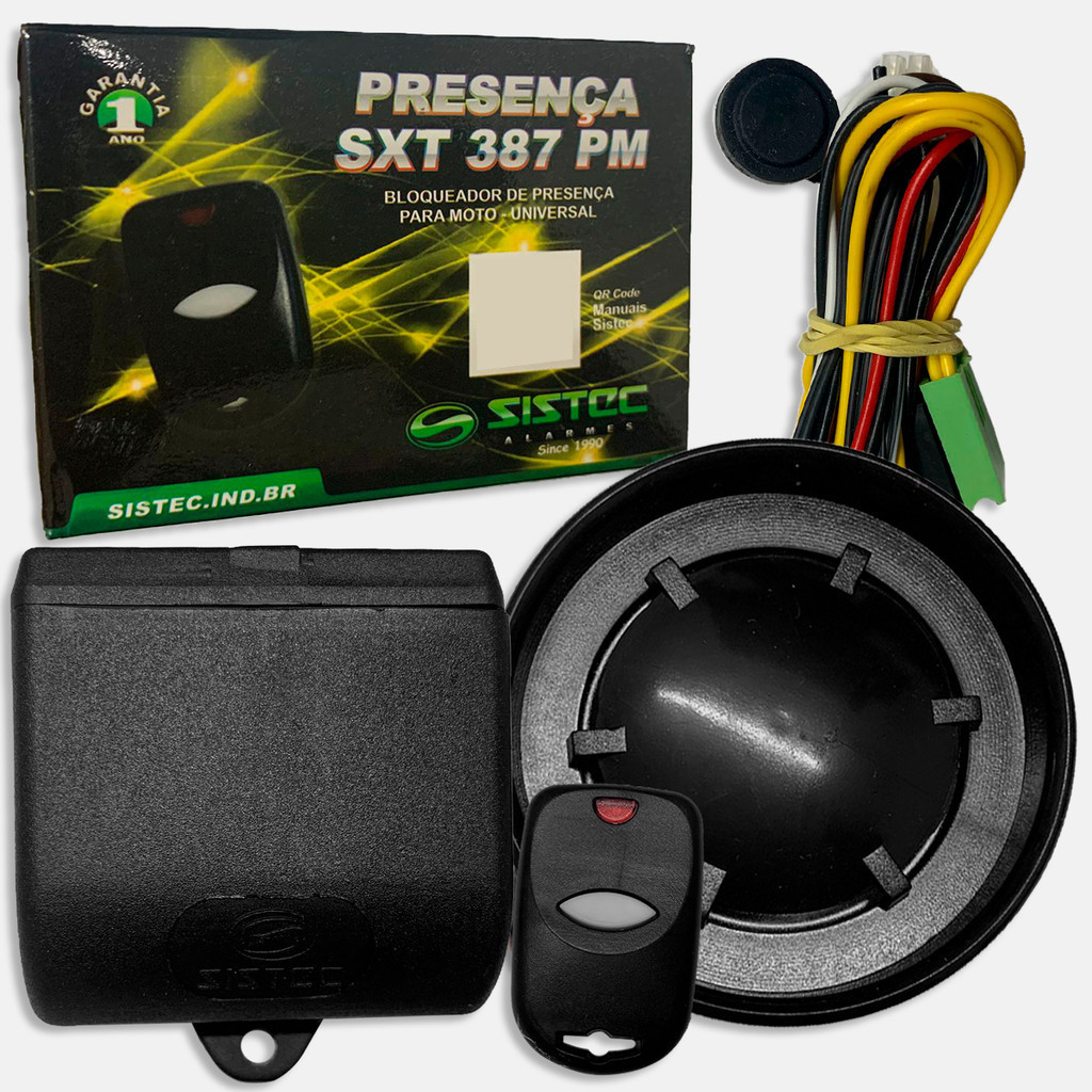 Bloqueador Moto Sistec Alarme Universal Controle Presença Antifurto Inibe Ligação Corrente SXT 387 PM Resgate Sensor Aproximação Afastamento Segurança Sirene O Bloqueador por presença/afastamento SXT 387 para motocicletas é um produto inovador, produzido com componentes de alta qualidade, sendo a melhor opção para quem busca segurança aliada com praticidade e modernidade para sua motocicleta. [FUNCIONAMENTO] O bloqueador funciona de forma prática e eficiente. Quando a ignição do veículo estiver ligada e o controle de presença se afastar do veículo em 20 metros, começará a contar o tempo de 90 segundos. Após esse tempo, o veículo entrará em disparo de sirene e, após 30 segundos de disparo, entrará em bloqueio. A sirene irá parar de tocar e a motocicleta desbloquear/liberar somente quando o controle de presença se aproximar do veículo. [CARACTERÍSTICAS] • Instalação super simples. • Universal, serve em todas as motocicletas. • Cinco opções de tempo de bloqueio. • O controle de presença deve estar sempre em posse do proprietário. • Acionamento automático - basta se afastar. • Bloqueio por afastamento. • Não consome bateria da motocicleta. • Controle remoto auto code. • Alcance de até 20 metros. • Possui sirene. [ESPECIFICAÇÕES TÉCNICAS] • Tensão de Operação: 10 a 16 Vcc • Corrente Máxima de Bloqueio: 15A • Corrente Máxima de Sirene: 750mA • Consumo Típico: 2,5mA [CONTEÚDO DA EMBALAGEM] • 01 Central • 01 Controle de Aproximação • 01 Chicote • 01 Sirene • Manual de Instalação