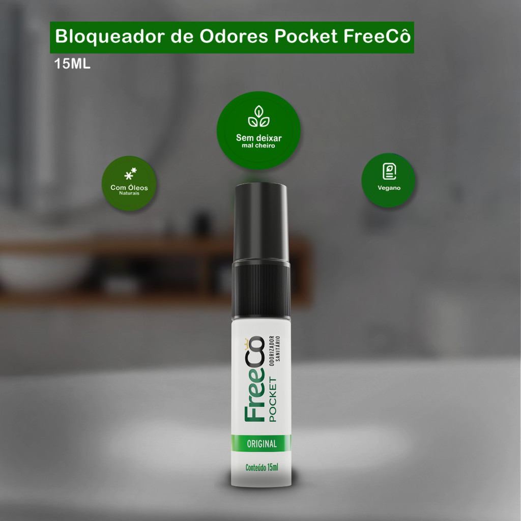 Bloqueador de Odores Pocket Original 15ml FreeCô Com fragrância de capim limão, FreeCô é 1º bloqueador de odores sanitários do Brasil, eliminando de forma definitiva o mau cheiro do nº2 e o constrangimento em utilizar o banheiro. Indicação de Uso: - Ideal para levar no bolso, na bolsa, necessaire, pasta ou mochila. Fragrância: Original / Capim Limão Embalagem: 01 frasco de 15ml
