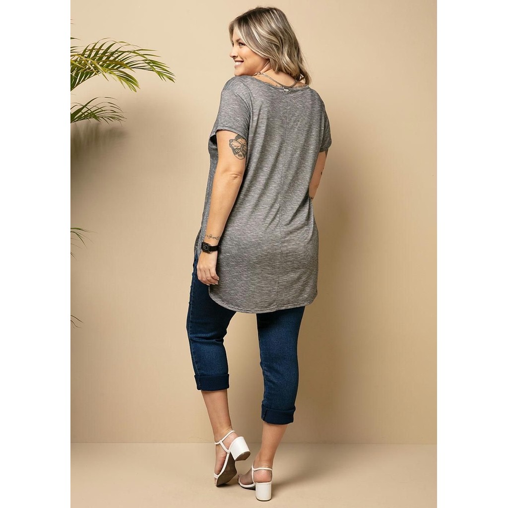 Blusa em malha flamê de viscose com poliéster. Decote V, com bolso frontal e detalhe de barra arredondada, com fendas laterais.