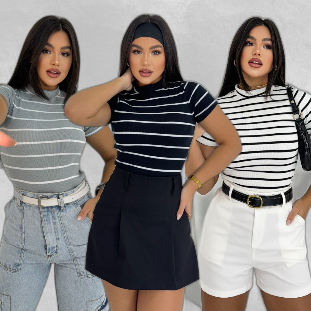Blusa Básica Listrada Ribana Canelado Premium Casual Basico Camiseta T-Shirt