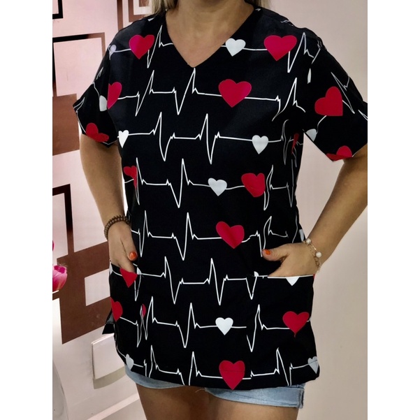 Blusa Bata Camisa Estampada Scrub Pijama Hospitalar Cirúrgico feminina raio coração preta enfermagem cuidadora