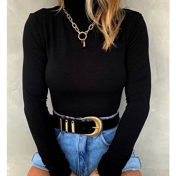 Blusa Cacharrel Gola Alta Manga Longa Suplex Segunda Pele Moda