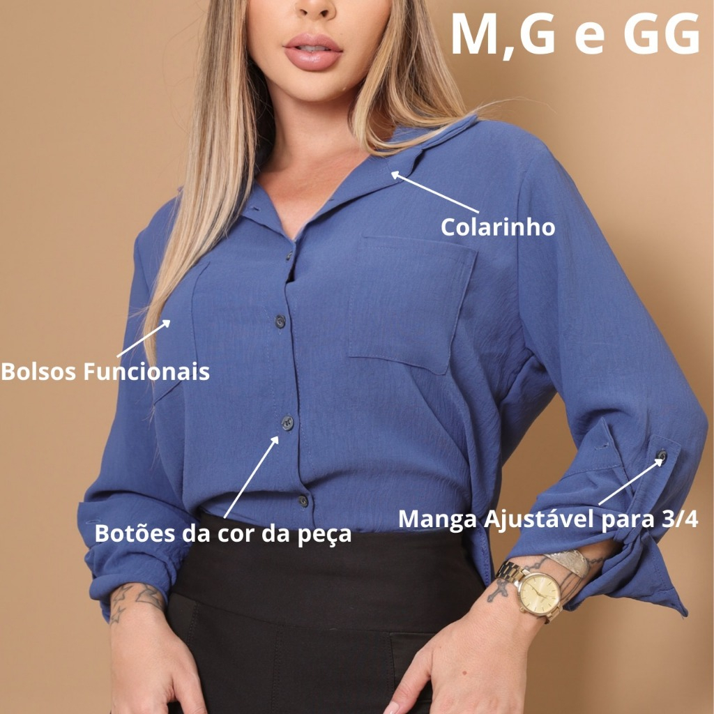 😉 ******TAMANHOS DISPONÍVEIS******* ❤️ M (40): Busto 50 | Cintura 52 | Comprimento 60 G (42): Busto 52 | Cintura 54 | Comprimento 62 GG (44): Busto 54 | Cintura 56 | Comprimento 64 📦 PRONTA ENTREGA, ENVIO RÁPIDO! 📦 👚 Camisa Feminina Social Manga 3/4 com Bolsos – Elegância e Estilo no Tecido Duna Se você busca um look moderno, confortável e com aquele toque de sofisticação, essa camisa é a escolha certa! Confeccionada em tecido Duna, leve e com ótimo caimento, ela traz um visual estiloso e versátil para qualquer ocasião. ✨ Destaques do produto: ❤️Tecido Duna: confortável, leve, macio e com elasticidade 👗Manga 3/4: prática e moderna 🥰Botões frontais na mesma cor da peça 😊Dois bolsos funcionais frontais – estilo e praticidade no mesmo look 😍Modelagem acinturada que valoriza o corpo Cores lindas e atuais ✅ Ideal para trabalho, faculdade, eventos ou dia a dia. Combine com jeans, saia ou alfaiataria e arrase com uma única peça!