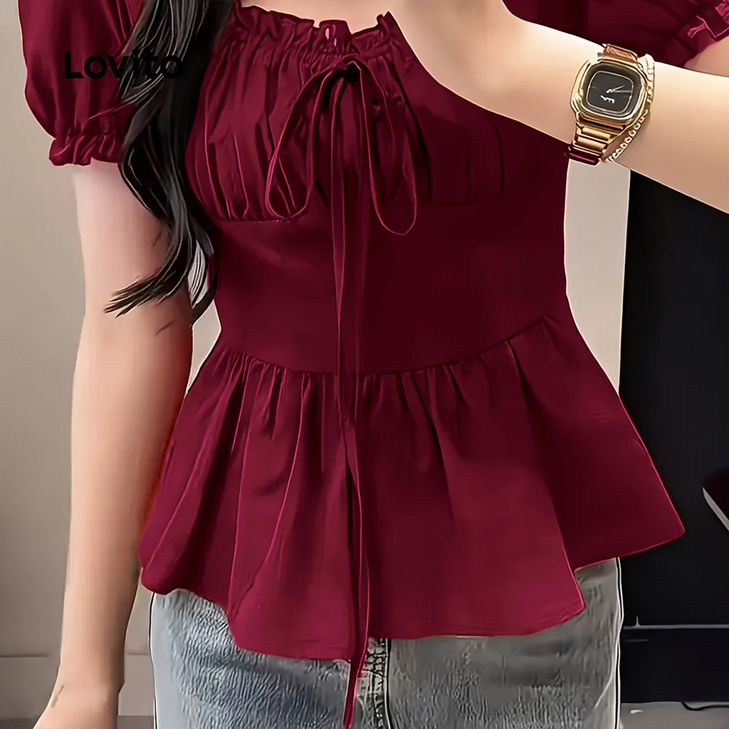 ✅DESTAQUES -❤️Guarnição de alface -❤️Gravata frontal -❤️Bainha com babados -❤️Macio e confortável -❤️Primavera e verão -❤️Zíper lateral ✅DESCRIÇÕES Estampa / Padrão:Plano Estilo:Casual Tamanho Plus:Não Material:Poliéster Composição:100% Poliester Tipo de modelagem:Regular Fit Transparência:Não Esticar:Não-elástico Feito na China ✅O PACOTE INCLUI 1XBlusa ✅INTRODUÇÃO LOVITO A Lovito é uma marca em crescimento que acredita no poder das meninas. Estamos comprometidos em oferecer opções de roupas fashion e acessíveis, para todos os estilos, necessidades e identidades. Acreditamos que a moda deve ser divertida, liberadora e fazer você se sentir incrível. Afinal, o melhor acessório para qualquer look é a autoconfiança! ✅NOTAS DE COMPRA Antes de comprar, dê uma olhadinha na tabela de medidas disponível no site. Lembre-se de que, por serem feitas manualmente, as medidas podem variar de 1 a 2 cm. As cores dos produtos também podem ter pequenas diferenças em relação às fotos, dependendo da iluminação e das configurações do seu dispositivo. Siga nossa loja e conheça novos itens e as melhores ofertas para você!! Se você tiver alguma dúvida, converse conosco e responderemos o mais rápido possível.😊