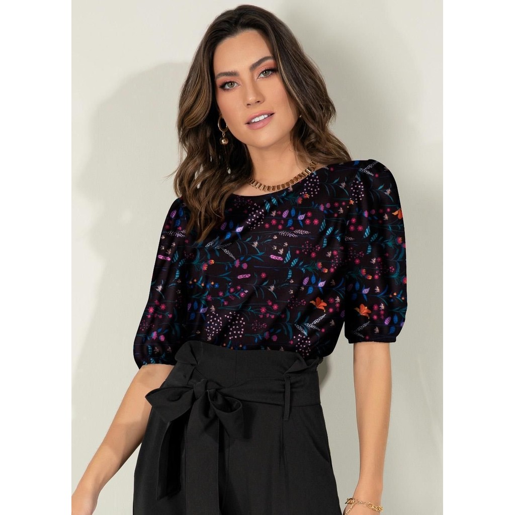 Blusa em malha de poliéster com elastano. Modelo soltinho, com decote canoa e mangas 3/4 levemente bufantes.
