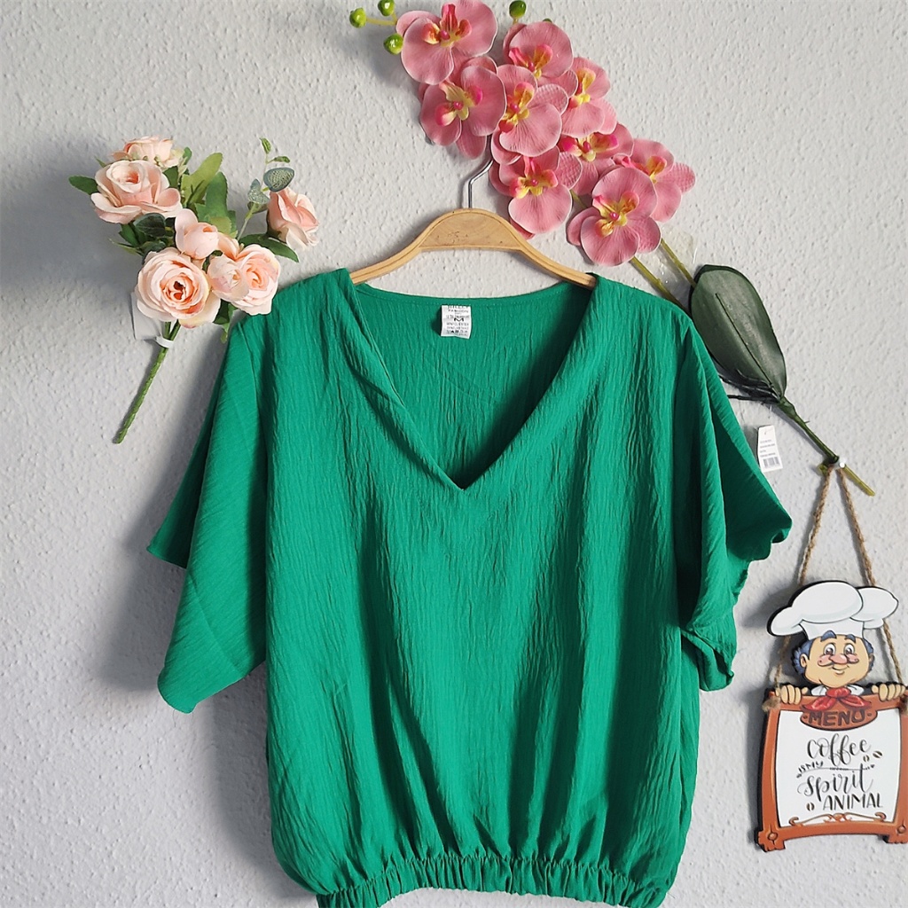Blusa crepe duna feminina elastico na cintura gola V moda feminina de verão, solto