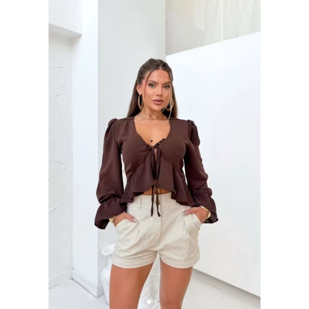 blusa cropped de amarração manga com babado frente estilo boho chic tendência 2025
