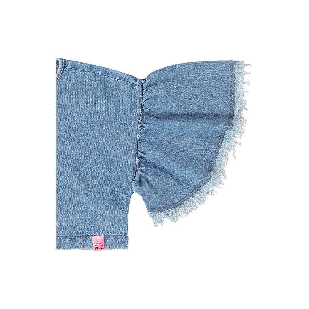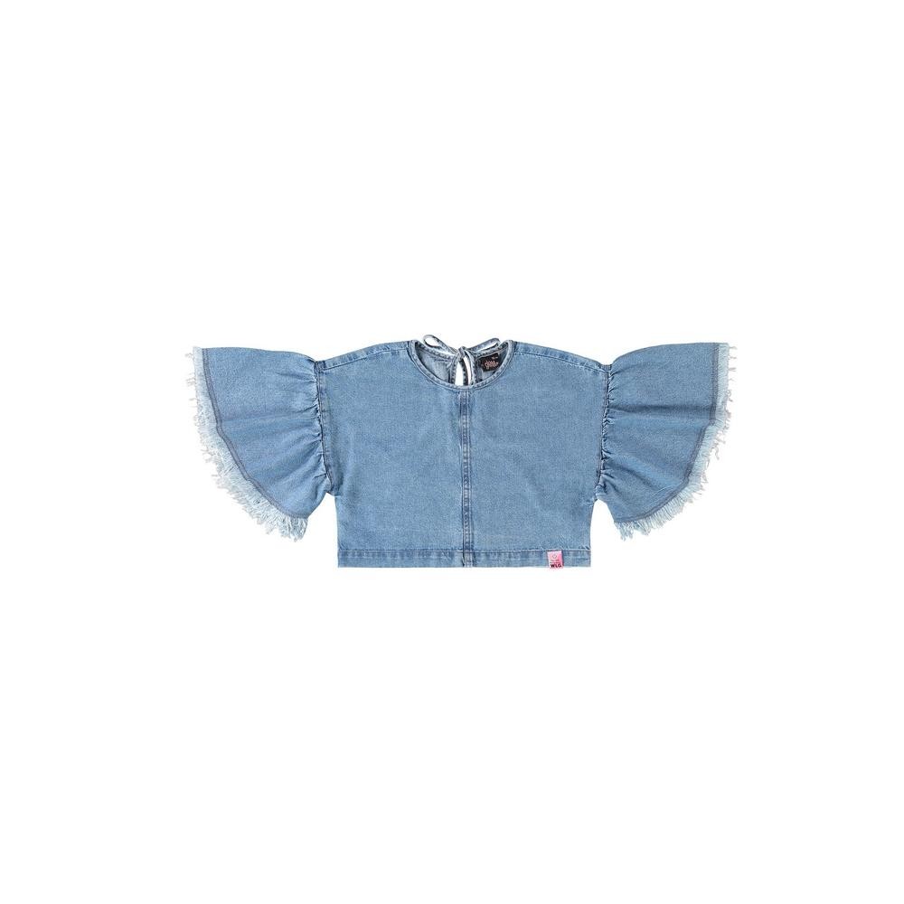 Blusa cropped infantil manga curta, confeccionada em jeans. As mangas possuem detalhe desfiado e nas costas fechamento por gota com amarração para facilitar a vestimenta.Tecido: Blusa: JeansComposição: 100% algodãoDecote/Gola: RedondoModelagem: JustaForro: NãoComprimento Manga: Curta