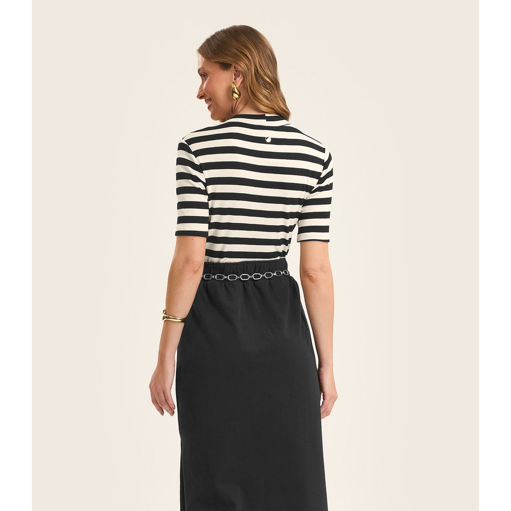 Blusa cropped confeccionada em ribana de viscose listrada, oferecendo conforto e caimento leve. Possui gola moldada com acabamento estruturado e mangas curtas. As barras das mangas e da peça têm acabamento com costura dupla, garantindo maior durabilidade. Modelo moderno e versátil, ideal para compor looks casuais com um toque estiloso.