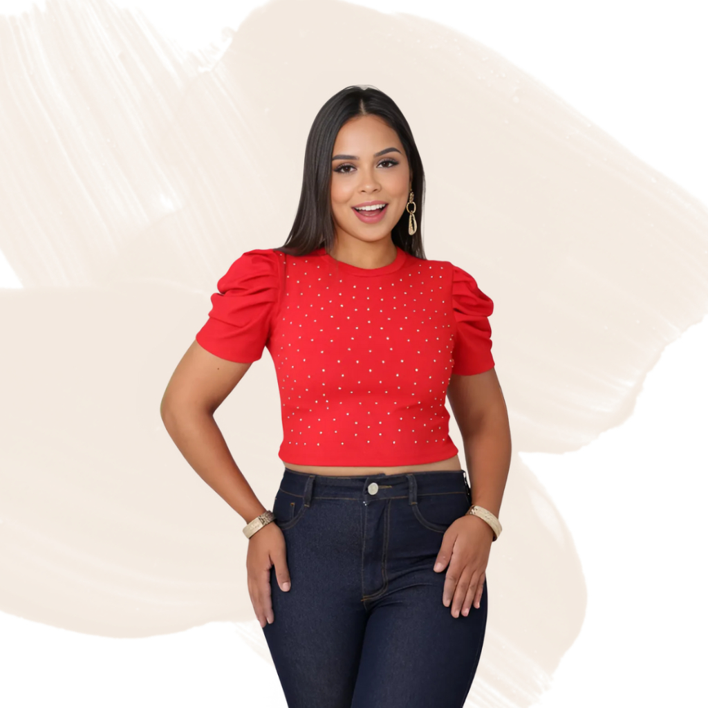 blusa cropped feminino com manga bufante princesa com detalhes de brilhos na frente