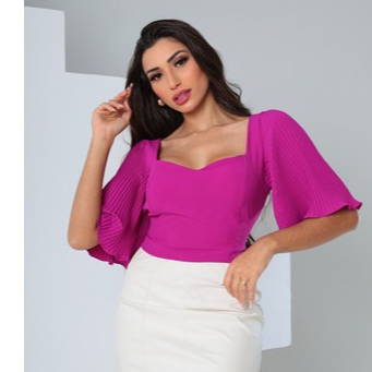Blusa Cropped Feminino Elegante Com Manga Plissada e Bojo