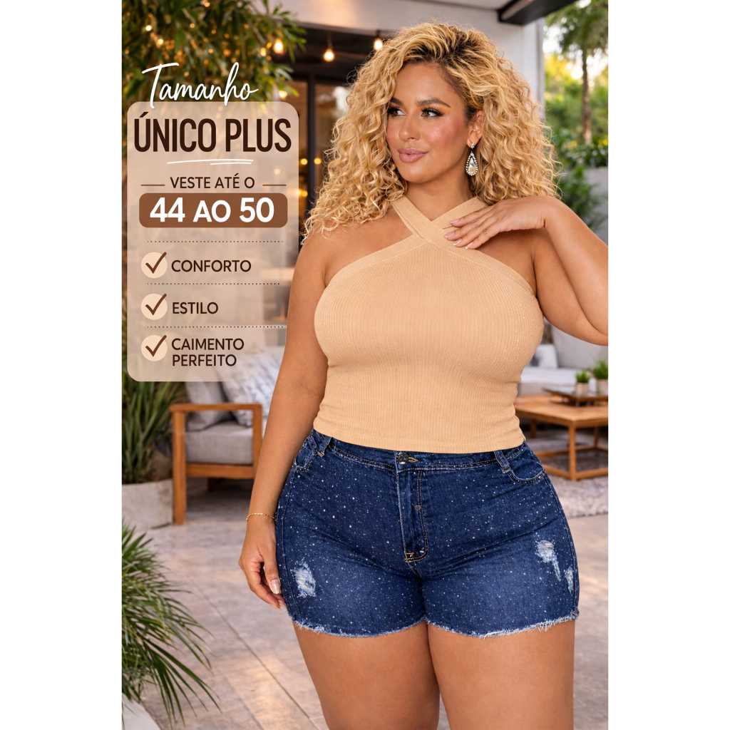 Blusa Cropped feminino Plus Size anarruga, com Elasticidade Tamanho Grande 44 a 50 Produto: Cropped Plus Size Modelagem: Justa / Comprimida (efeito modelador) Comprimento: Alongado (não mostra a barriga) Decote: Transpassado no pescoço (halter) Alças: Sem mangas Elasticidade: Alta Transparência: Não possui 🧵 Tecido Ana Ruga Toque macio Excelente elasticidade Não marca Não fica transparente Confortável para uso diário 📏 Tamanho Tamanho Único Plus 👉 Veste do 46 ao 50, adaptando-se bem ao corpo devido à alta elasticidade do tecido. ✨ Diferenciais ✔️ Efeito mais comprimido ✔️ Valoriza o busto ✔️ Não mostra a barriga ✔️ Conforto e estilo para o público plus ✔️ Ideal para quem busca segurança e elegância
