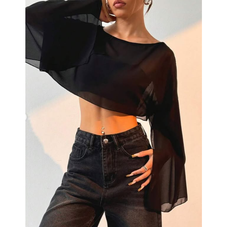 Blusa Cropped Tule Manga Longa