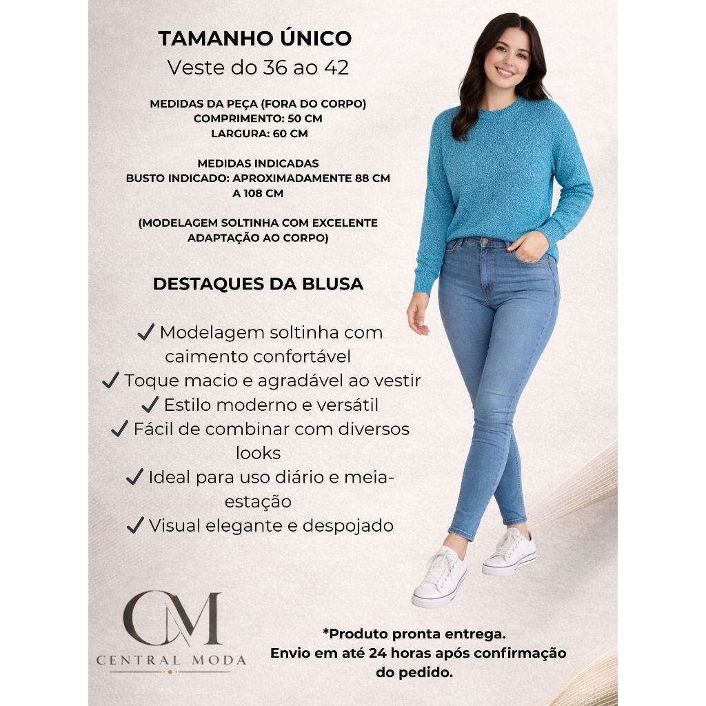 Bem-vindo à nossa loja Central Moda. Envio em até 24 horas após a confirmação do pedido. Destaque-se com estilo e conforto com esta blusa feminina em tricô mesclado, perfeita para quem busca um visual moderno e versátil sem abrir mão do conforto. Com modelagem soltinha e caimento despojado, a peça veste muito bem no corpo, proporcionando leveza e liberdade de movimento. O tricô possui toque macio e agradável, ideal para dias mais frescos. O efeito mesclado traz um visual sofisticado e atemporal, facilitando combinações com jeans, peças de alfaiataria ou sobreposições em looks mais elaborados. Uma peça essencial para compor produções casuais, urbanas e elegantes no dia a dia. DESTAQUES DA BLUSA ✔ Blusa feminina em tricô mesclado ✔ Modelagem soltinha com caimento confortável ✔ Toque macio e agradável ao vestir ✔ Estilo moderno e versátil ✔ Fácil de combinar com diversos looks ✔ Ideal para uso diário e meia-estação ✔ Visual elegante e despojado COMPOSIÇÃO Tricô de excelente qualidade TAMANHO Tamanho único Veste do 36 ao 42 MEDIDAS DA PEÇA (fora do corpo) Comprimento: 50 cm Largura: 60 cm MEDIDAS INDICADAS Busto indicado: aproximadamente 88 cm a 108 cm (Modelagem soltinha com excelente adaptação ao corpo) INFORMAÇÕES IMPORTANTES • As medidas podem apresentar pequenas variações. • As cores podem variar levemente conforme iluminação ou tela do dispositivo. • Produto pronta entrega. • Envio em até 24 horas após confirmação do pedido.