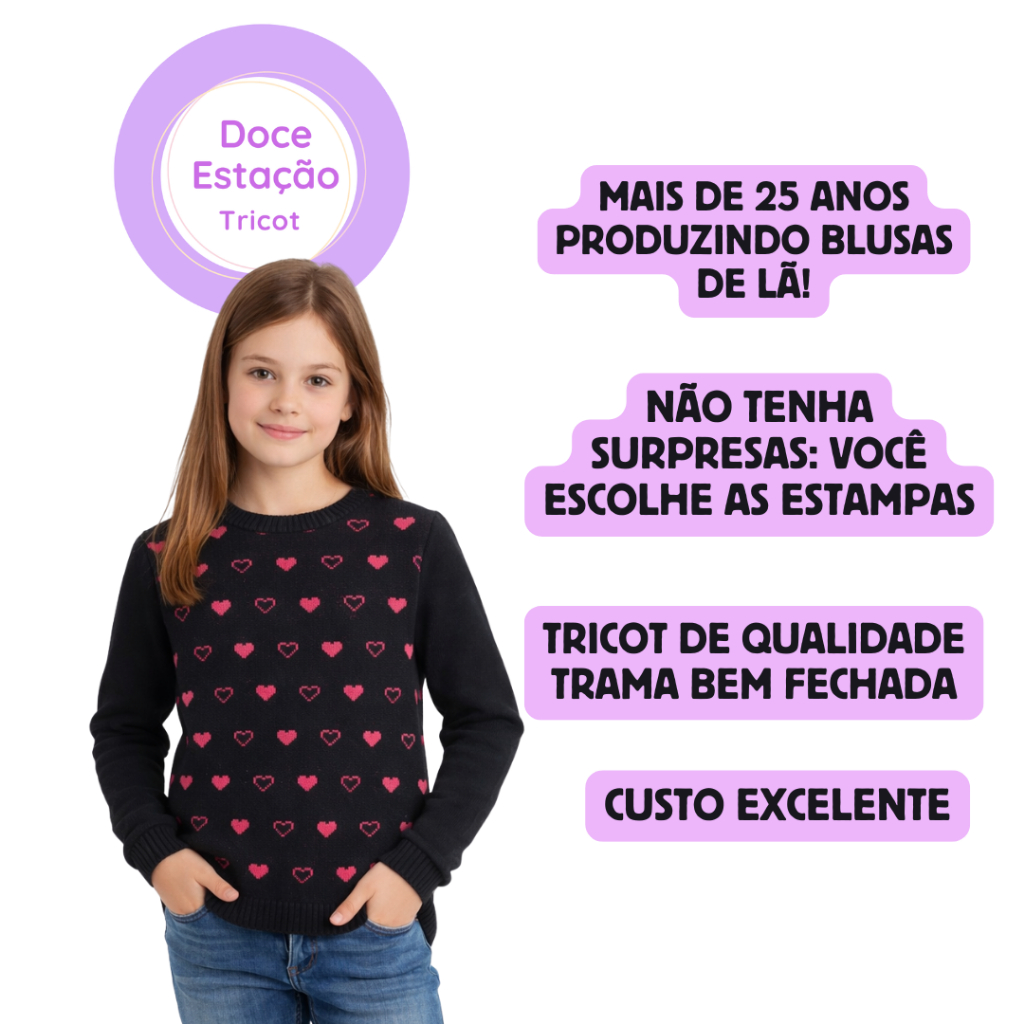 Blusa de Lã Juvenil menina super quentinha e confortável. Somos fabricantes garantindo assim o menor preço. Estampas lindas e qualidade do Tricô Excelente! Tamanhos disponíveis: - 8 (Veste de 7 a 8 anos) - 10 (Veste de 9 a 10 anos) - 12 (Veste de 11 a 12 anos) Características: - Material da Lã: 100% Acrílica - Estampas de Menina. - Produto Nacional Sobre a Fábrica Doce Estação Tricot: - Produz roupas de lã/Tricot a mais de 25 anos sempre prezando pela melhor qualidade e preço baixo. **PARA COMPRAR BLUSAS DE LÃ DE TAMANHOS MENORES (BEBÊ E INFANTIL) VÁ EM "VER LOJA" E ENTRE EM NOSSOS OUTROS ANÚNCIOS.