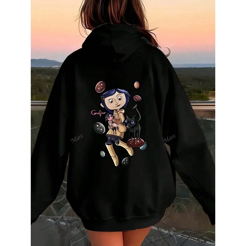 Blusa de Moletom Canguru com Capuz Unissex Coraline Caroline Preto Lançamento Envio Imediato